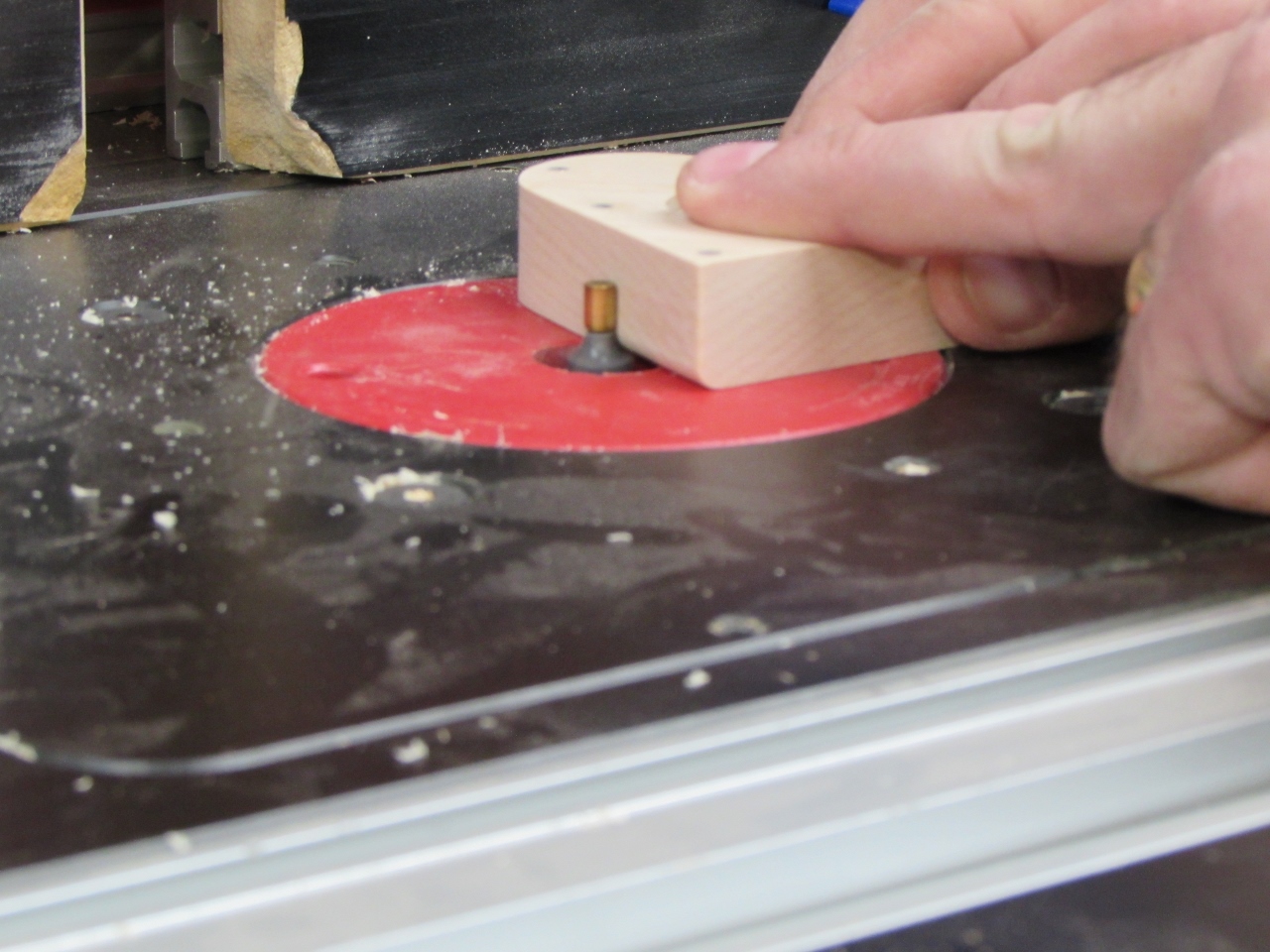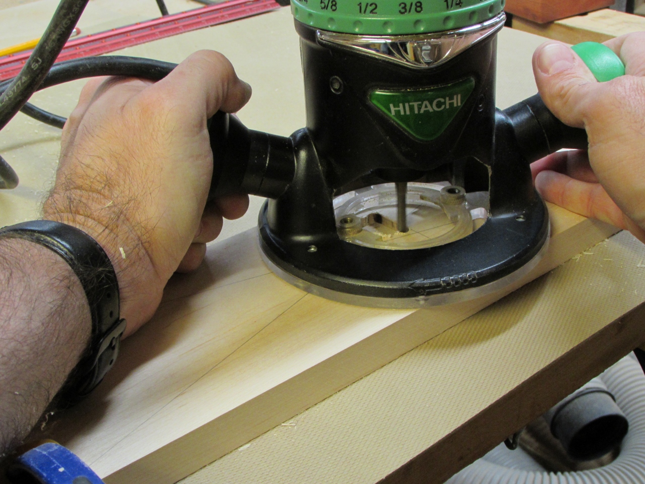 After sanding everything down to 220 grit, I got out my 1/8″ round-over bit that has a brass tip instead of a bearing.