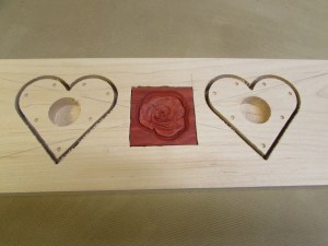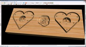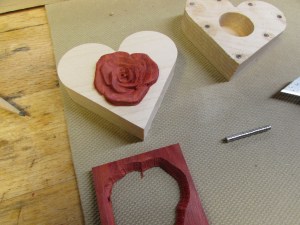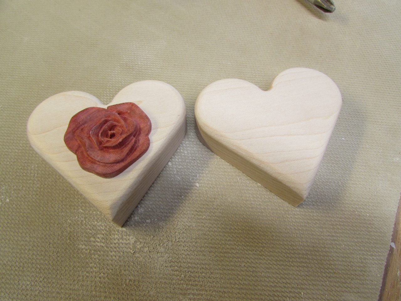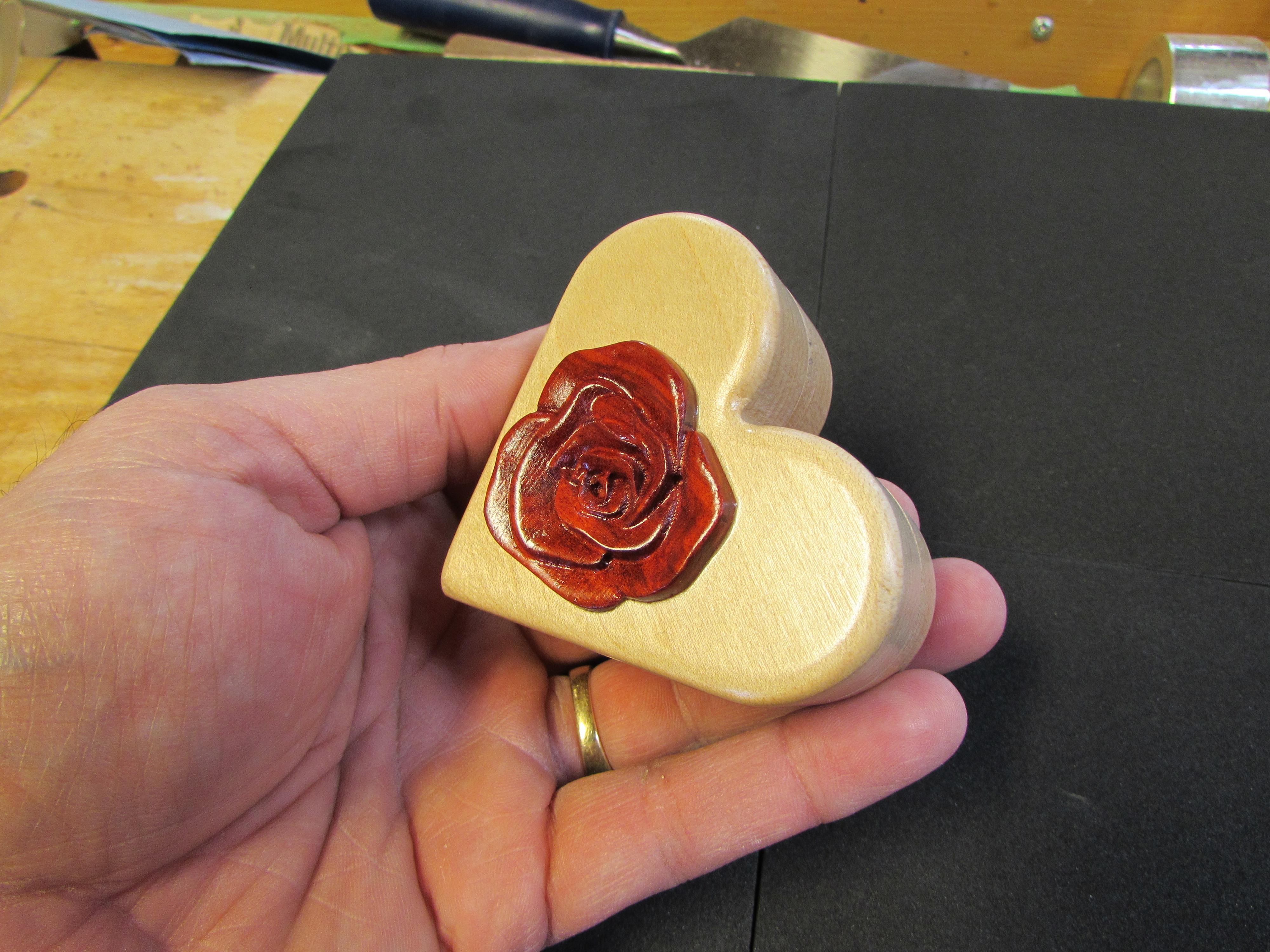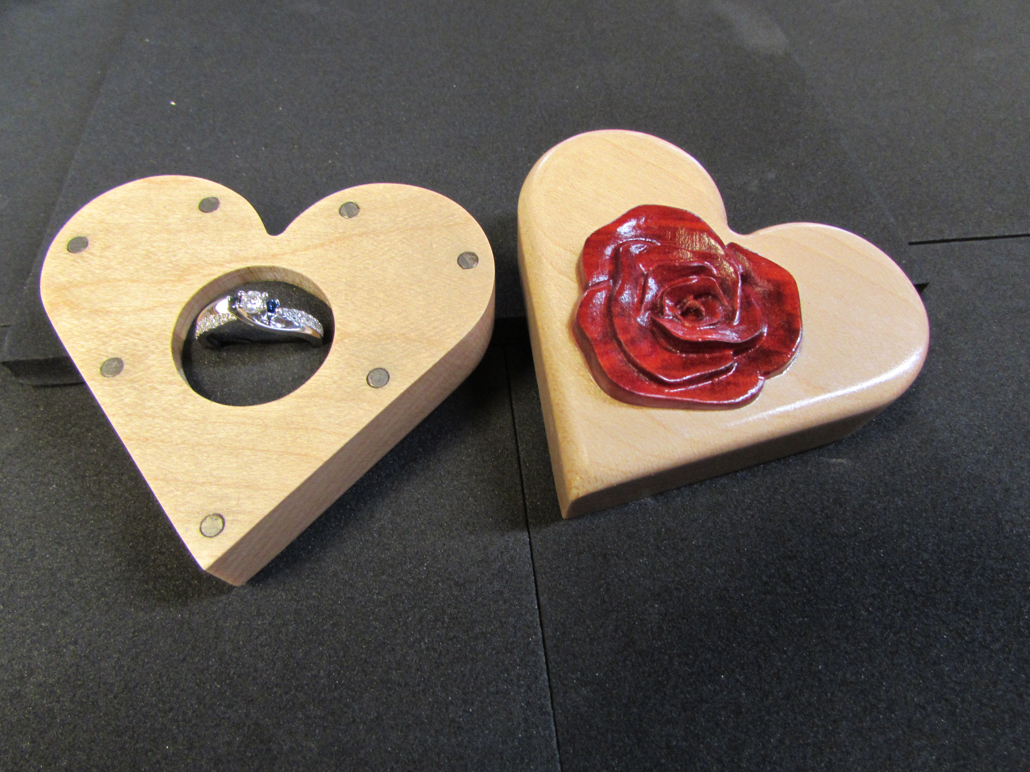 My oldest son recently came to my wife and I to tell us that he was going to propose to his girlfriend. Tracie and I are very happy for him, Elizabeth is a very nice young lady. I offered to make a ring box for him, so we sat down to come up with a design. He wanted a heart shape with a rose carved into the top. The rose has some significance in their relationship, so I suggested we carve it out of the wood redheart. For contrast, we decided on maple for the box. Since it is difficult to find a good location for hinges on a heart shape, I suggested magnets. I have some tiny 1/8″ diameter ones that would work well. This is what my design looks like in the Carvewright software.