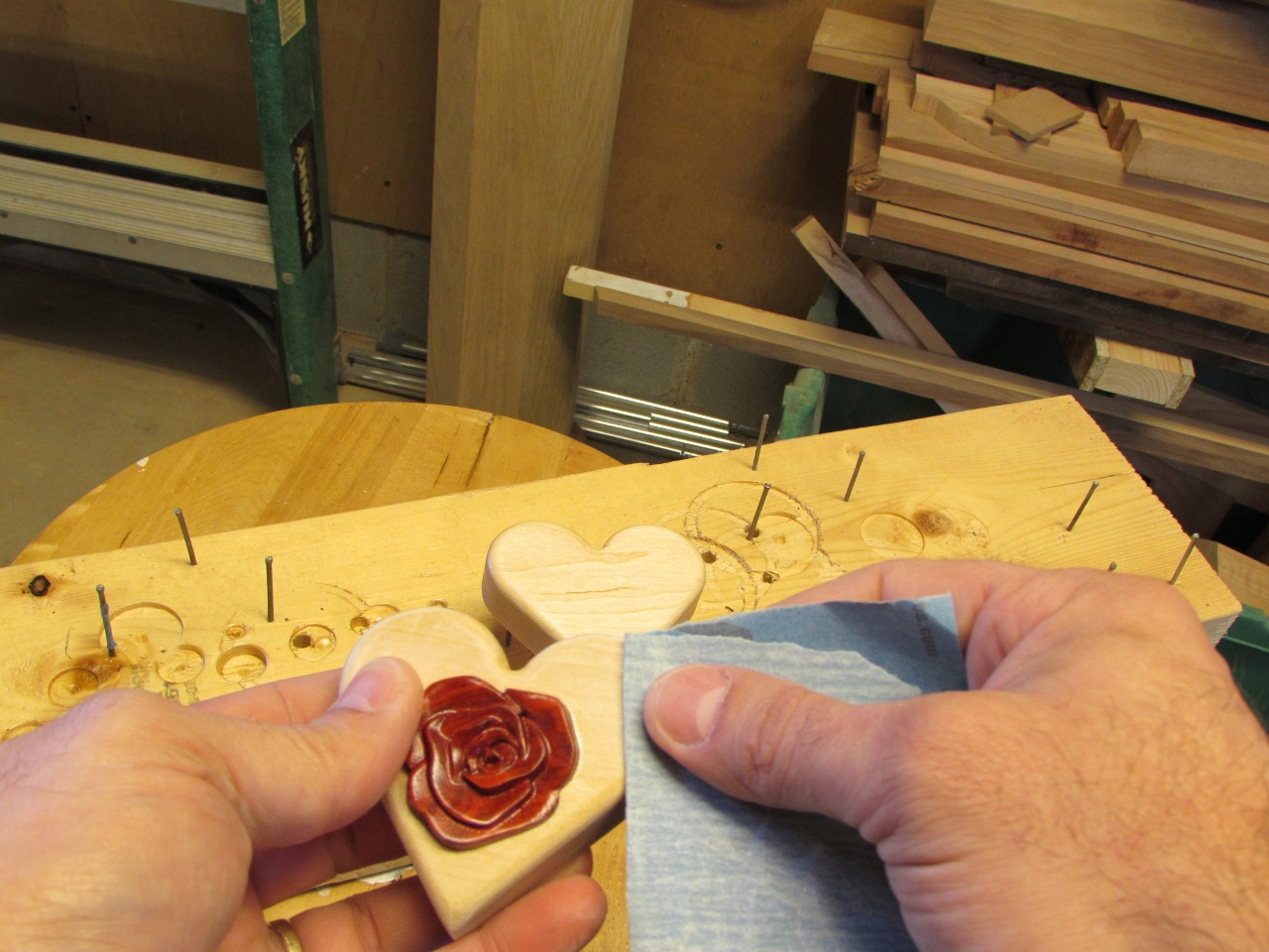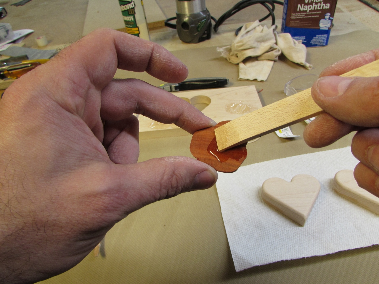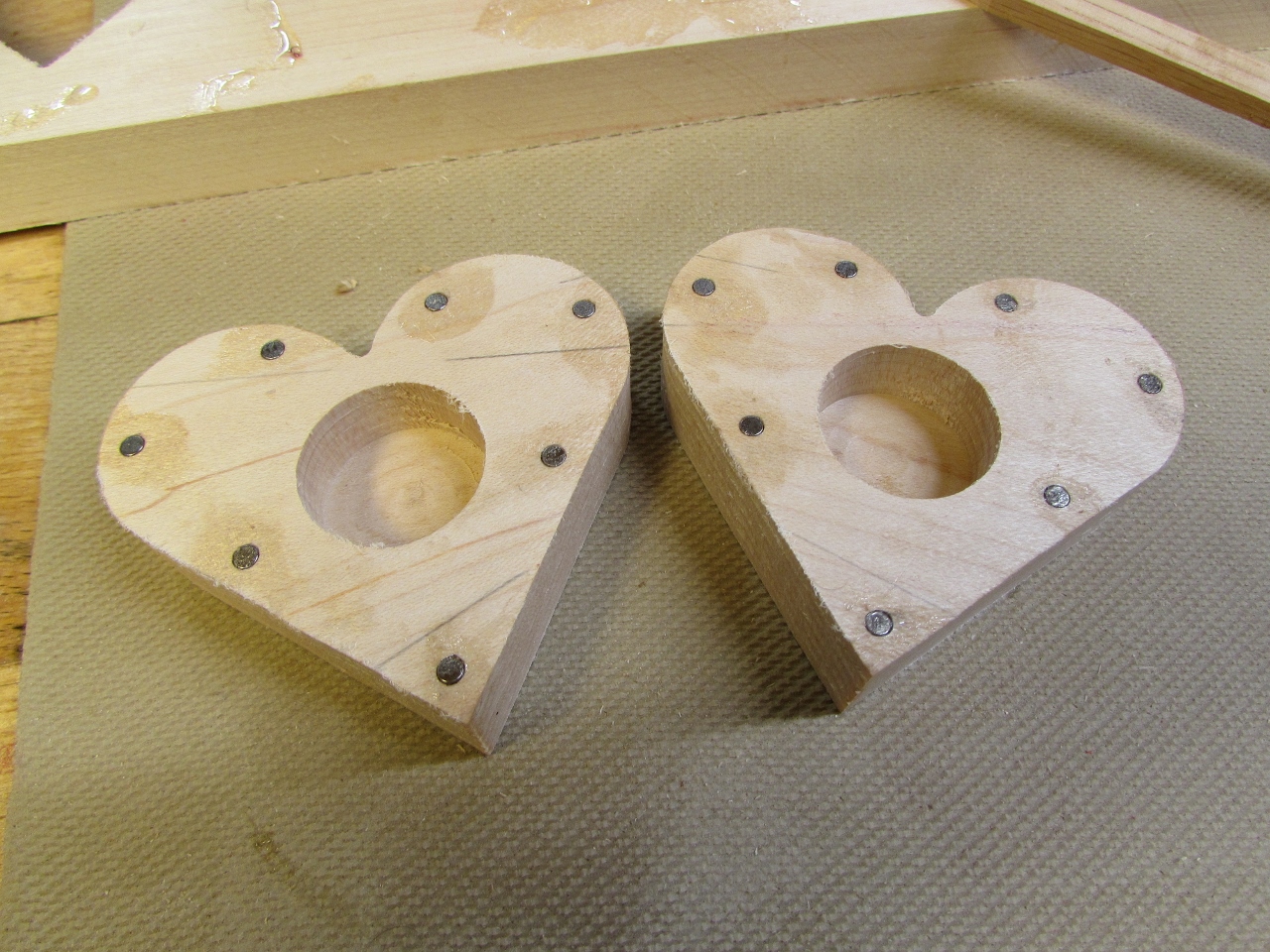 For the maple, I used a trick that I saw online. I ran the panel, upside down through my drum sander until I sanded through the back of the panel freeing the hearts without any damage.
