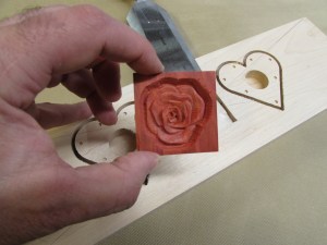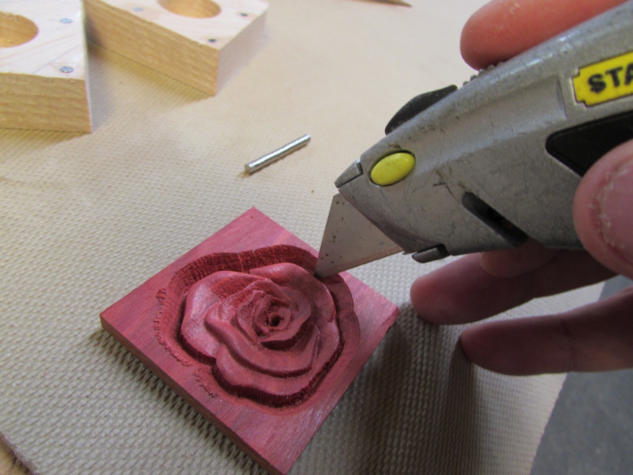 I deliberately made the thickness of the maple and the redheart slightly thicker than the carve. I did not want the hearts breaking free while the cutter was still running, and I wanted to be able to pry up the redheart without marring the rose.