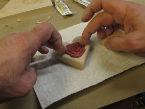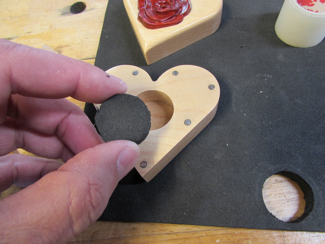 I placed a piece of double-sided tape at the bottom of the recess and pressed the redheart blank in.
