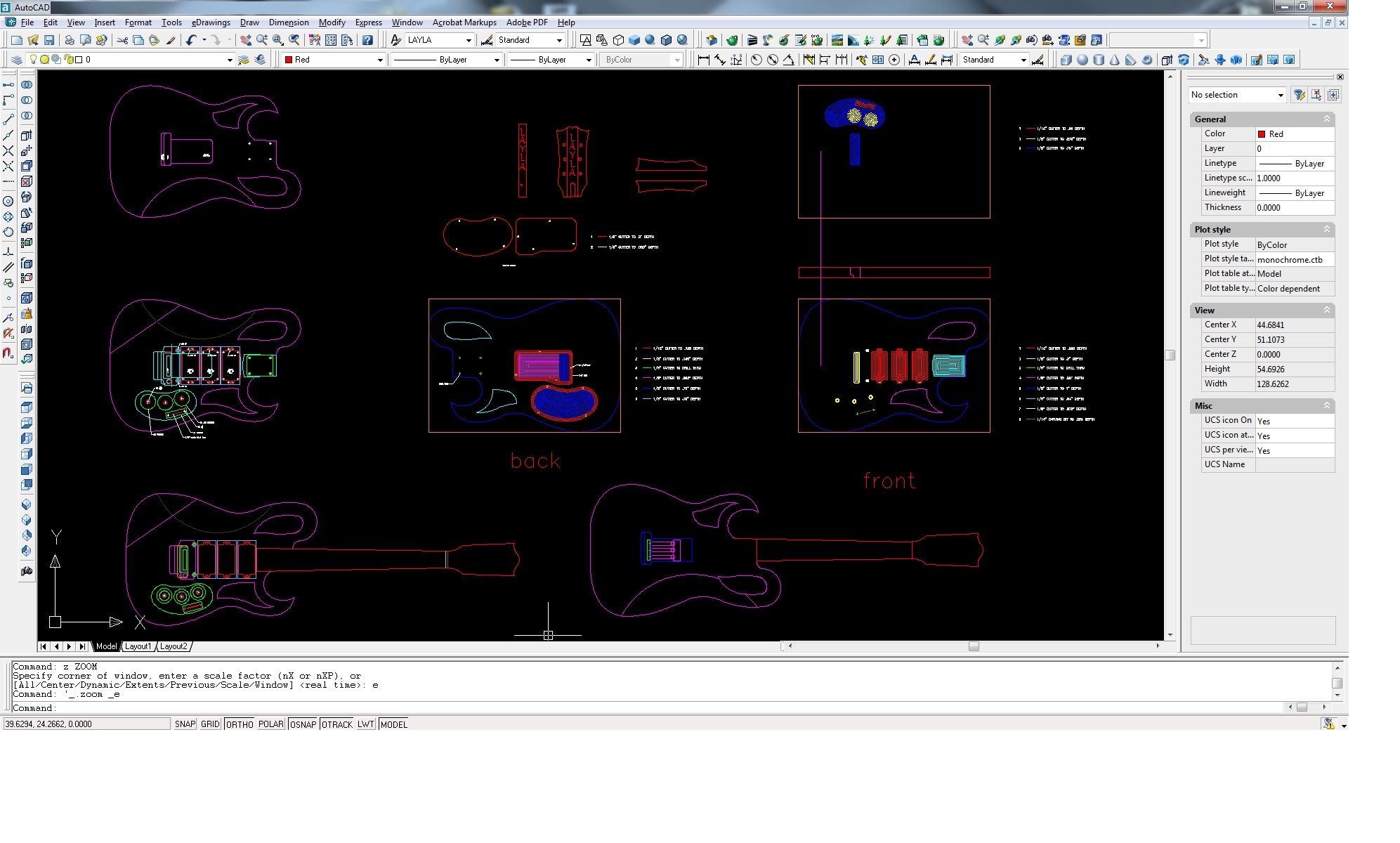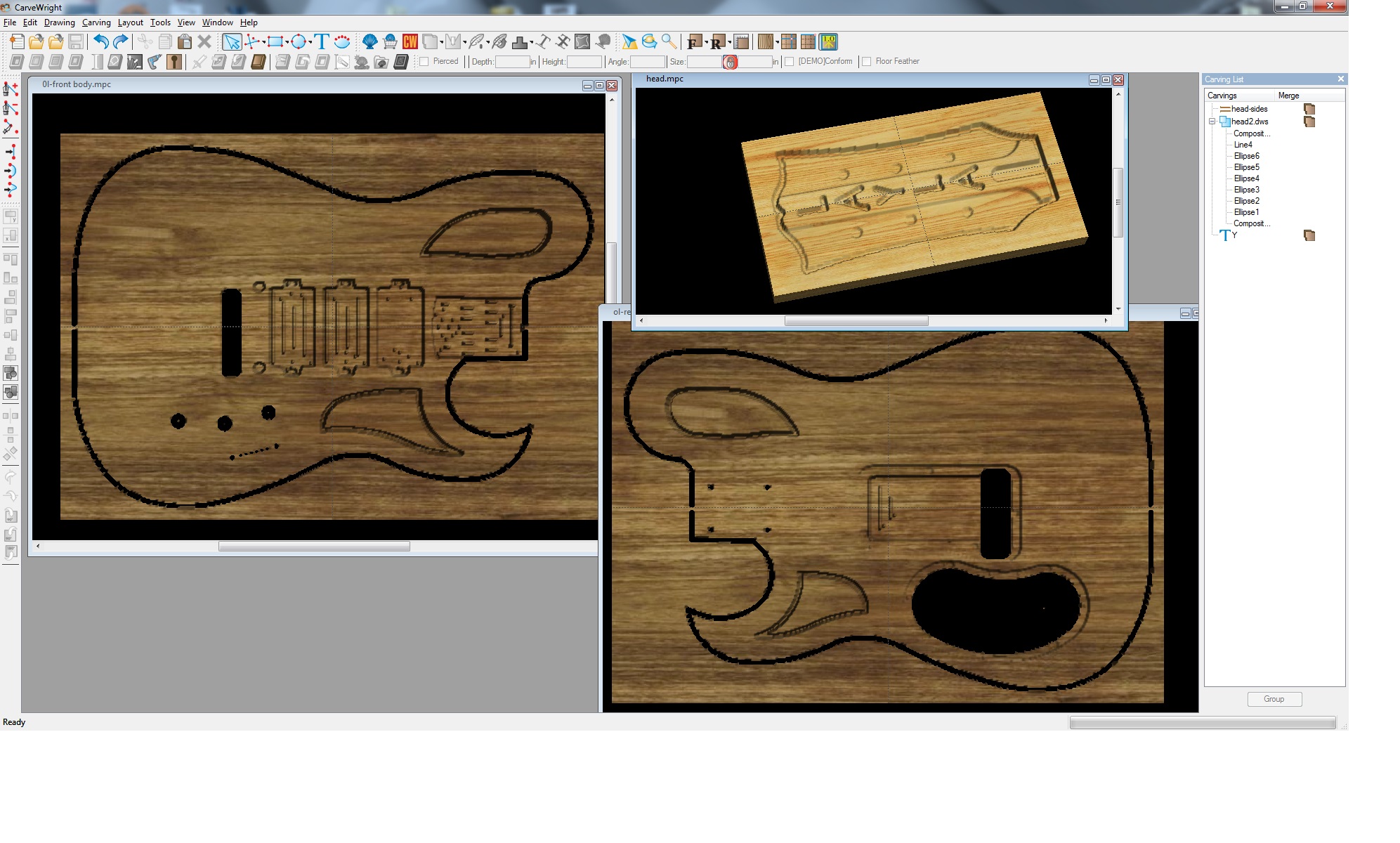 A lot of detailed planning is involved in this step. I need to lay out lines for tool paths, and I use different colors to indicate different cut depths. Then I import the lines, one color at a time, into my carving software and model up my simulated guitar body. The software is fairly accurate at showing the finished product but you still need to rely on a bit of experience and imagination to know how things will turn out. I am not looking for the machine to give me a finished product. That would require a lot more time, and probably a much more expensive CNC, but this little hobby machine can easily turn out a guitar body that can be finessed, with some hand and power tools, into a nice guitar.