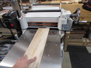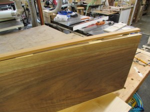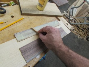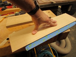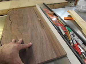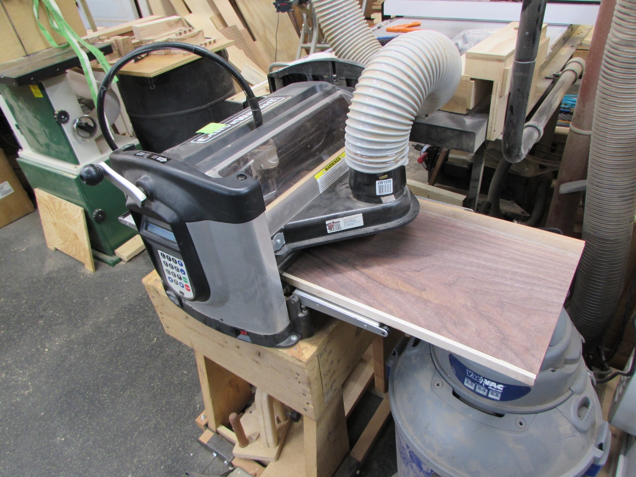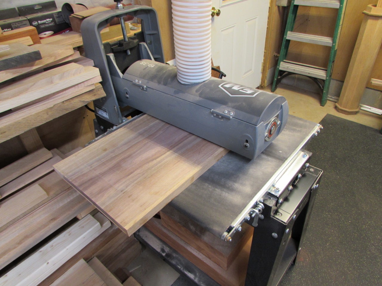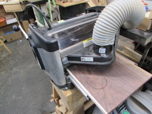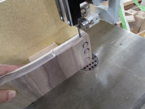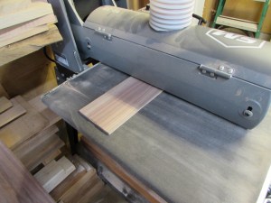 I used the drum sander to thin the walnut side of the veneer down to 1/16″ thick, and set it aside for us to do the inlay before attaching it to the head stock.