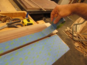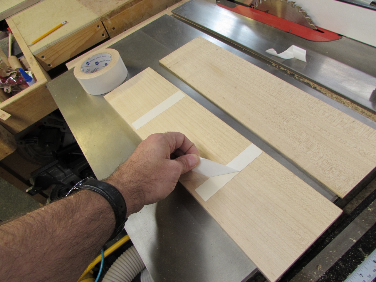 My walnut boards are just wide enough to fit the guitar, but the CNC requires 1/2″ on either side of the carve. To achieve this width requirement, I attach some extra strips to the outside, again with double-sided tape.