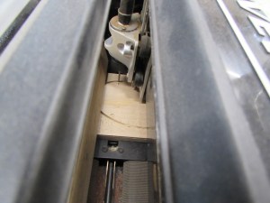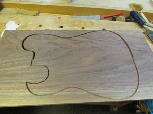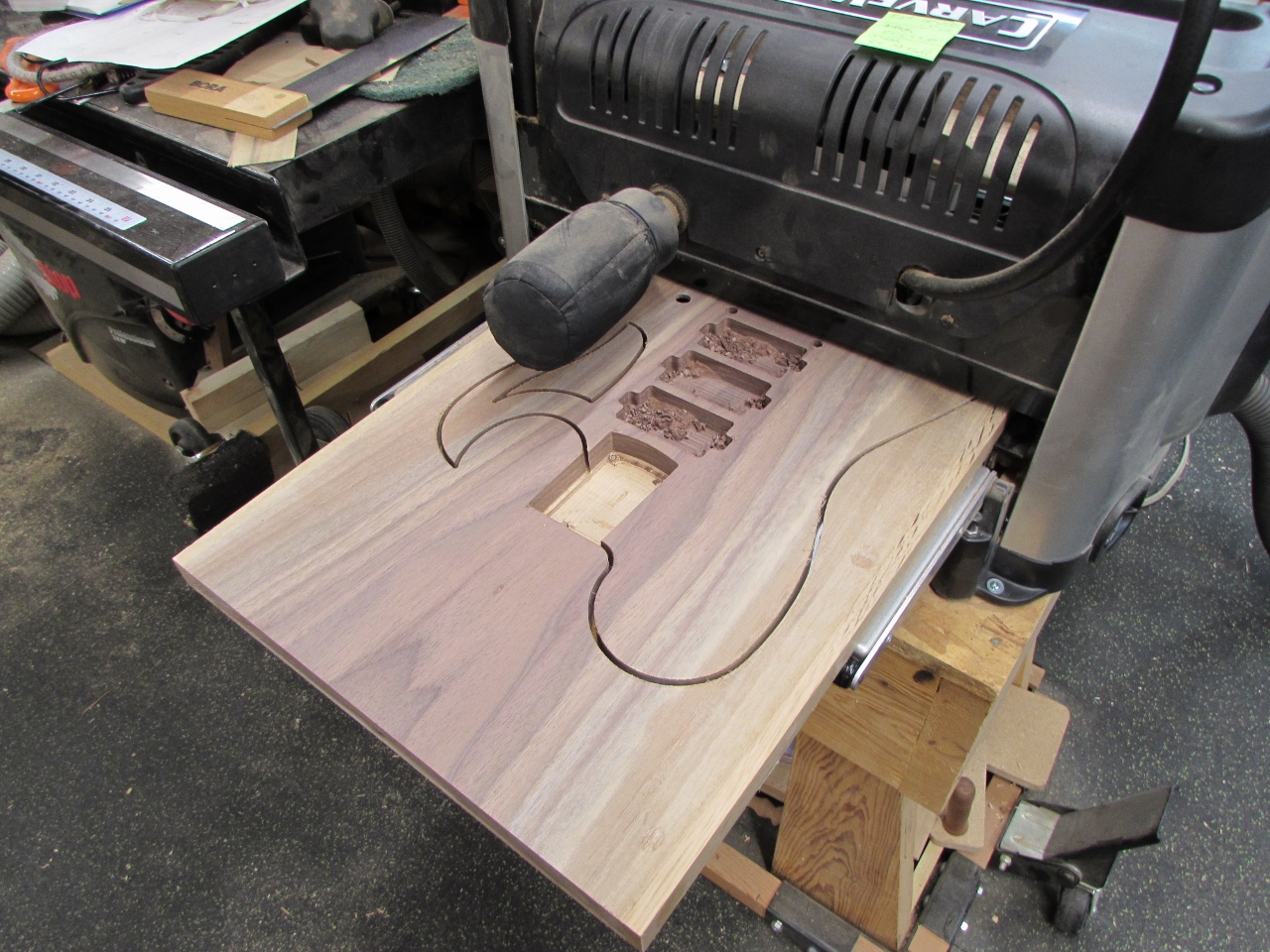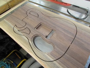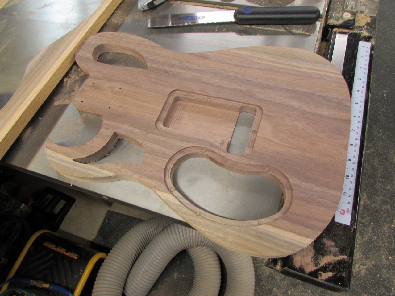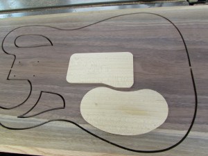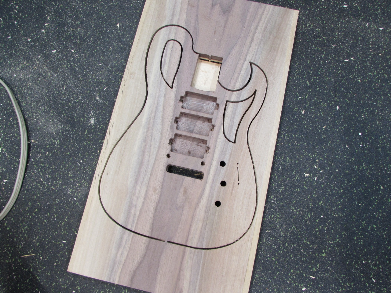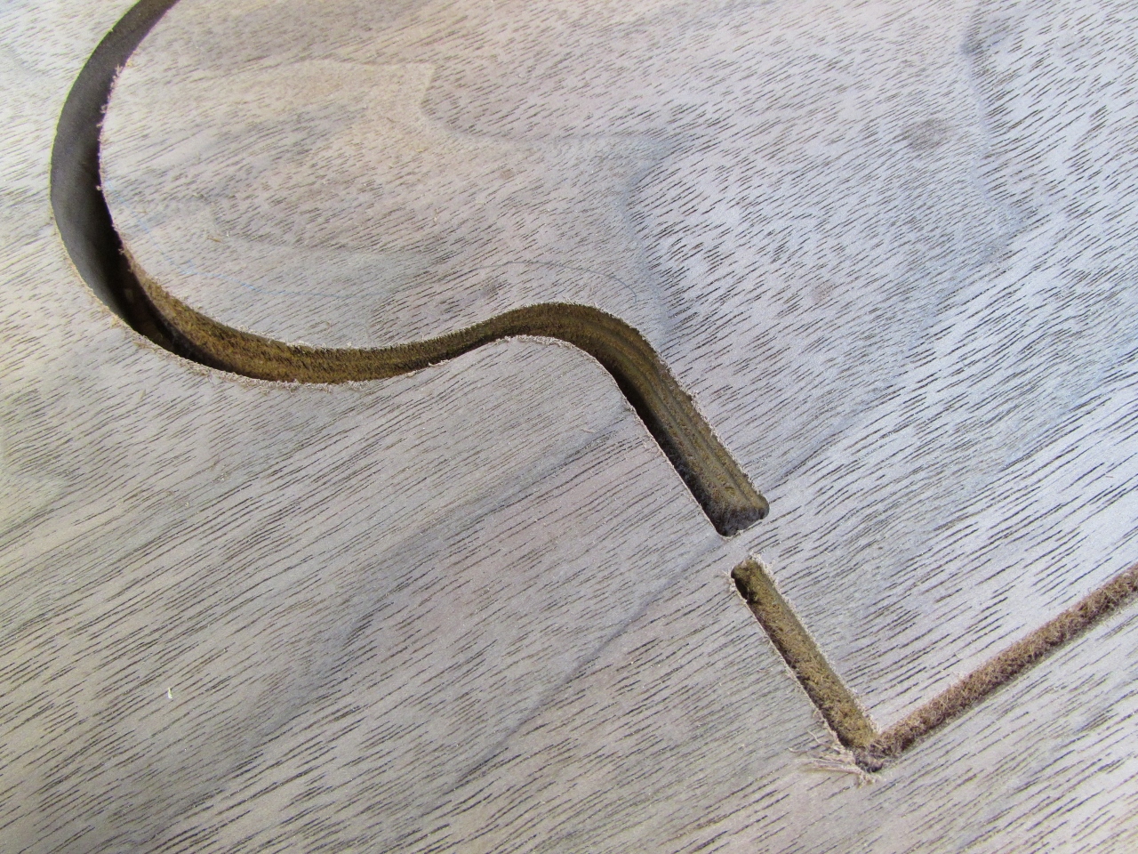 I have used this trick before without any trouble, but I failed to notice that one of my attached side strips was about 3/32″ shorter than the body. The tracking roller did not notice this problem and kept on cutting, shifting each successive pass 3/32″ to the right as it carved, resulting in a stepped carve. All I managed to create here is a guitar-shaped piece of scrap walnut…