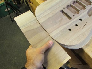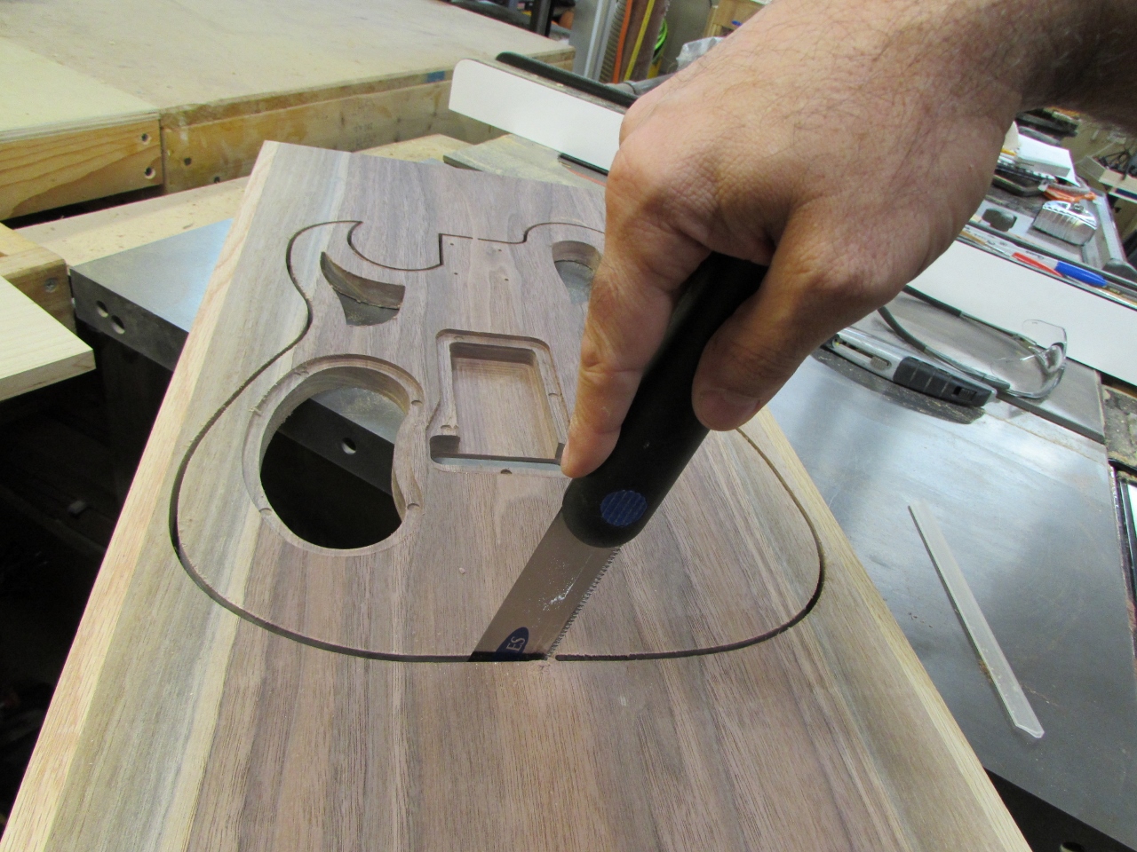 The neck Vicenç bought seems to be made of mahogany, but the top is painted black. We want to veneer it with walnut and carve the guitar’s name into it for a small inlay detail. To find walnut to match the body, I only have to look at my newly created piece of scrap.
