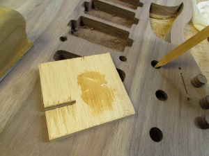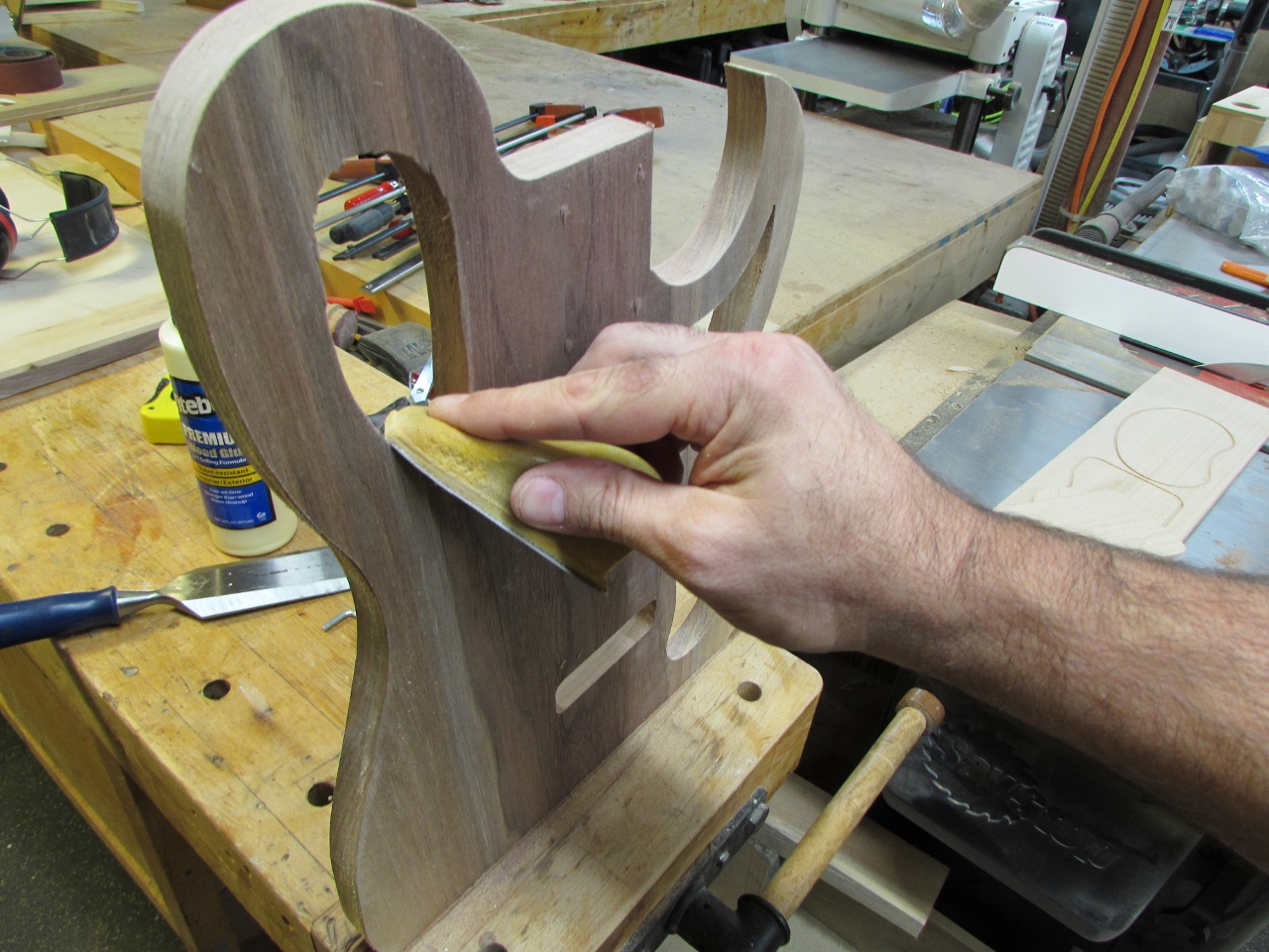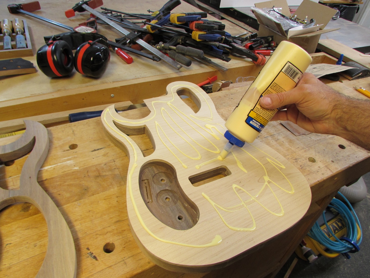 The last thing I need to do before Vicenç comes over tomorrow to finish working on the body, is to glue the back to the front. I use a thin piece of veneer to spread the wood glue around evenly, making sure to work quickly. If you move too slowly, the glue starts to dry out and won’t hold.