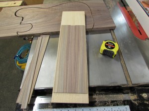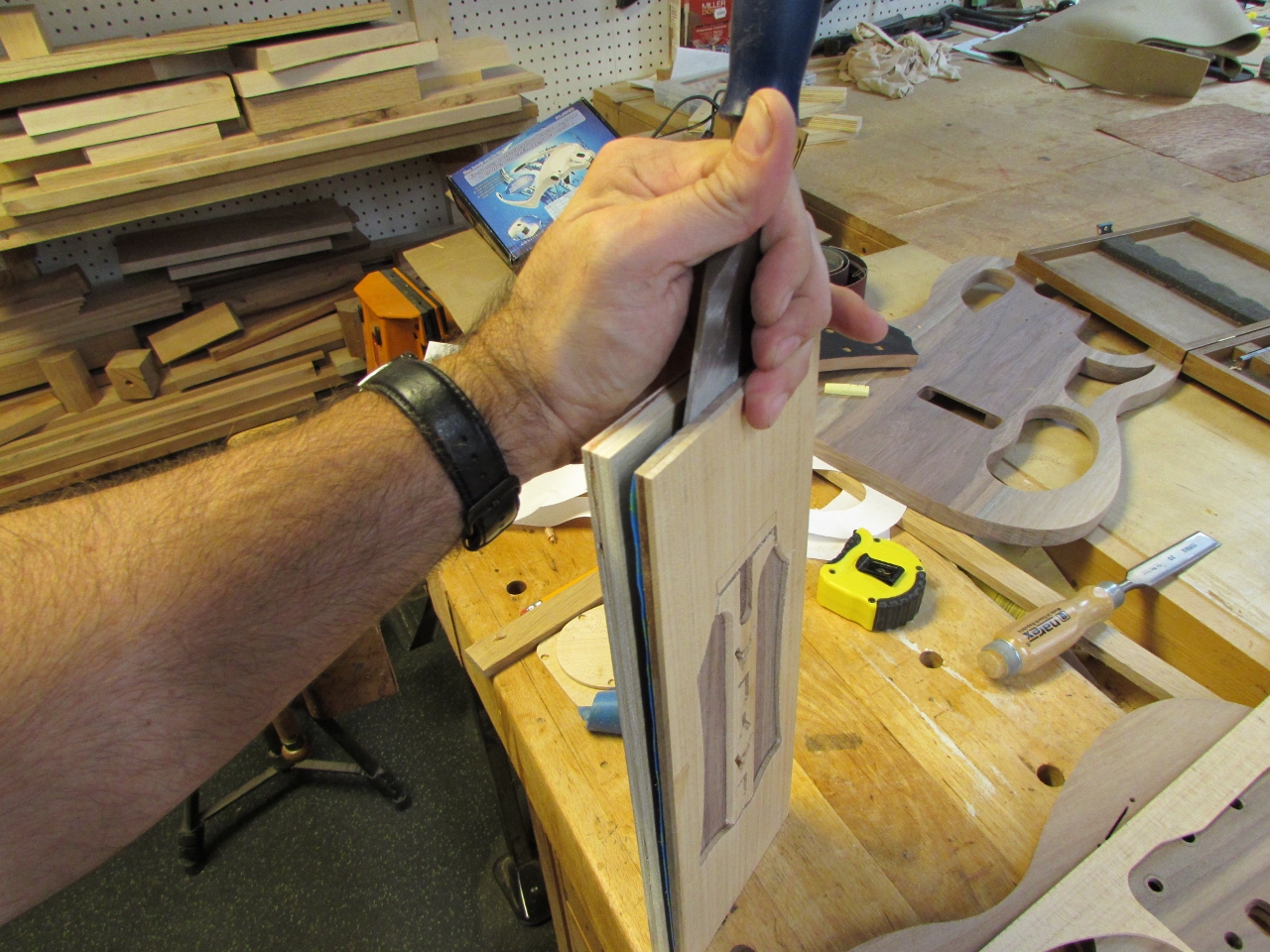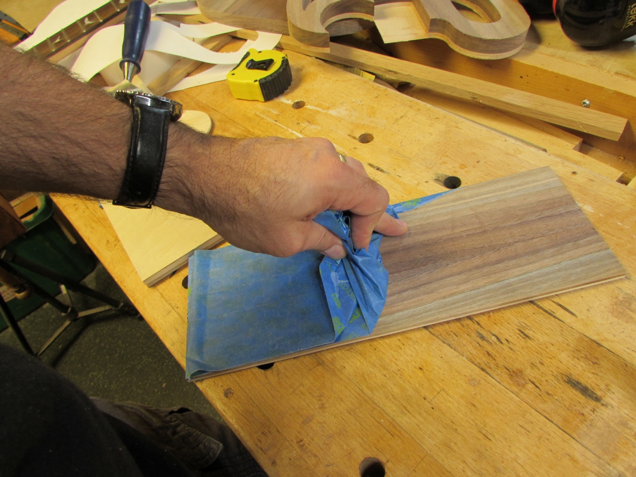 I trimmed the veneer to match the backer board exactly. Now this piece is ready to carve for the head stock.