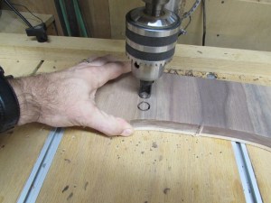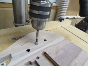 Then I used a 1/4″ forstner bit to drill a much smaller hole through the plug, then used the correct size drill bit to ream the hole out to the correct size. It is not a perfect match, but the glue line should all but vanish when the finish is applied, and everything will be completely covered by the knobs when they are installed.