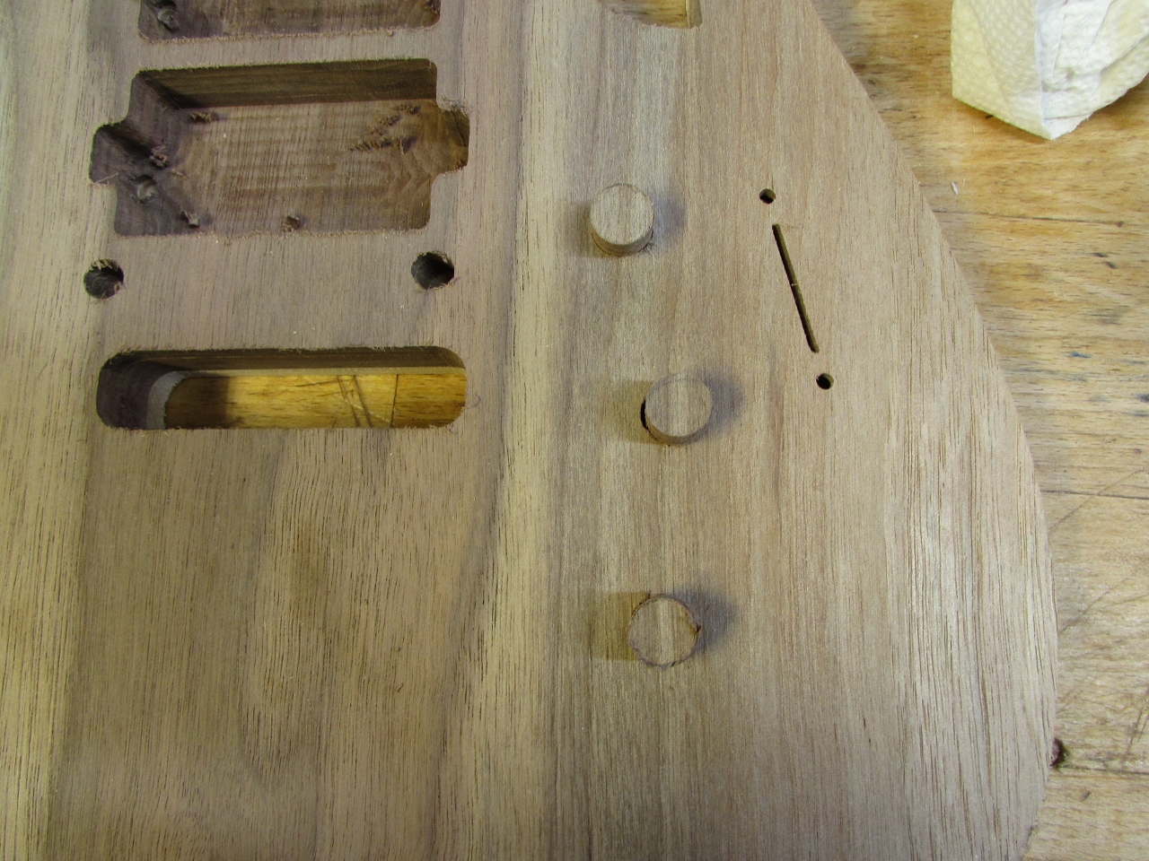 I grabbed the off-cut from the bottom of the carve, and made some 1/2″ plugs from an area with similar grain and color.
