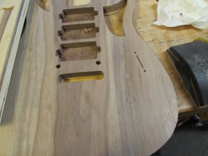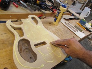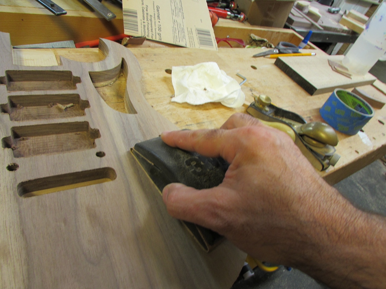 After the epoxy dried, I used my sanding block to sand the plugs down flush to the guitar body.