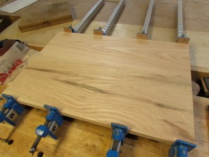 I pulled the clamps off of the bottom panel after it had dried and ran it through my wide drum sander to smooth the joint.