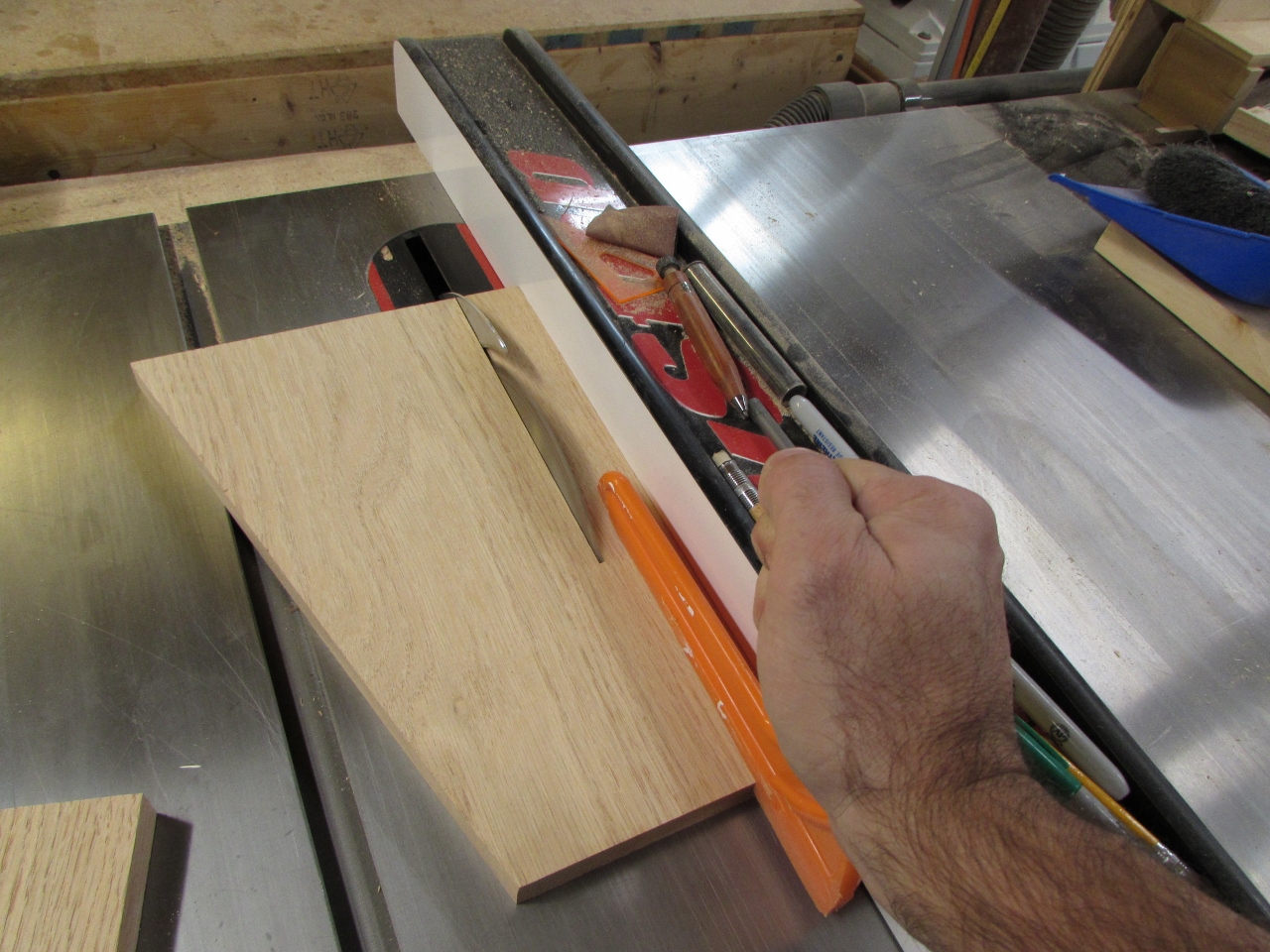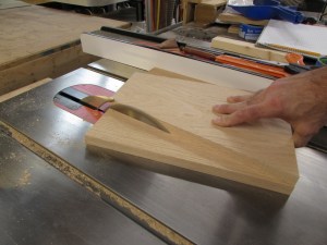 The edge is always a little rough off of the band saw, so I used the off-cut from the angle as a shim to hold the cut edge parallel to the table saw fence.