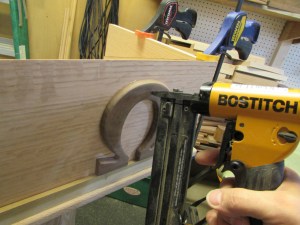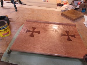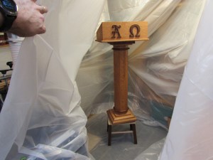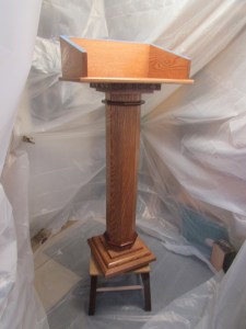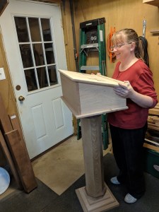 After I dry-assembled the top, it looked a little tall to me so I asked my wife to stand beside it. She is closer to the average size of most of the readers that will be using this stand, and she definitely thought it was too tall. The best way to reduce the size would have been to have a shorter column, but it is a little to late for that correction. I discussed the problem with Father Chuck and he agreed to allow me to cut down the height of the top from a 5″ opening down to a 3-1/2″ opening. Since the top is 19″ wide inside, there is room for two books to lay side-by-side removing the need for the extra height.