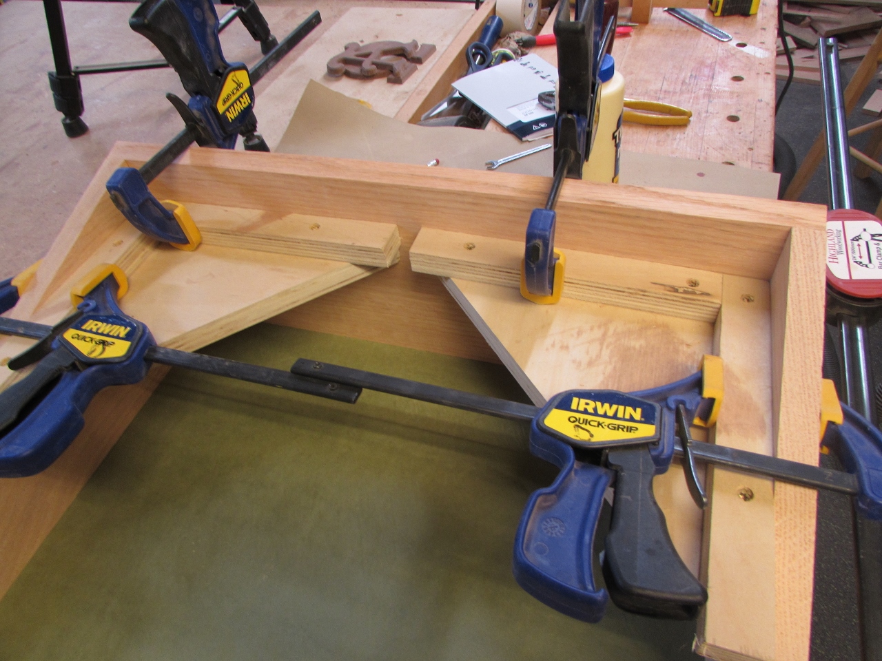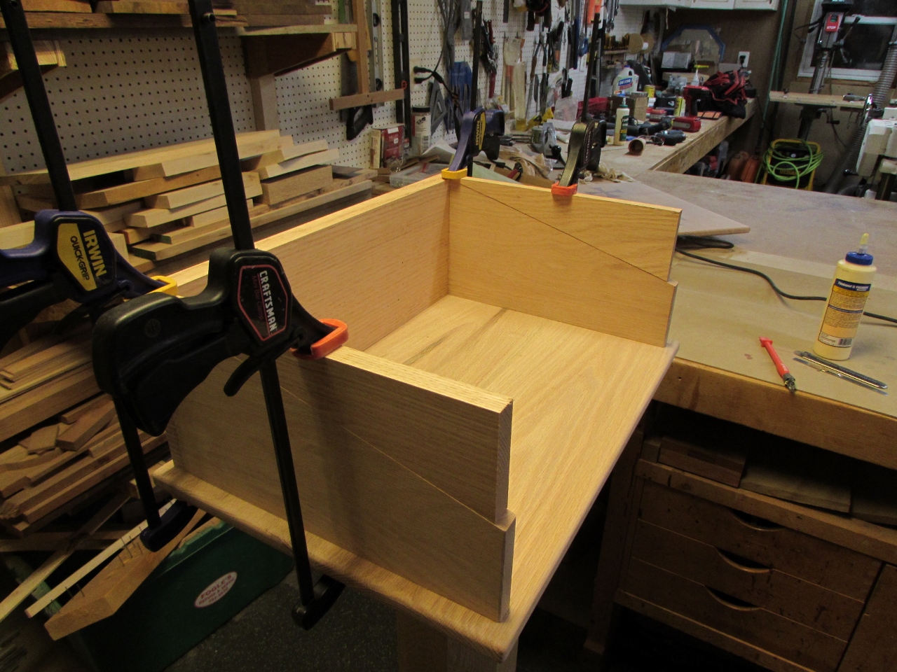 I used my homemade 90 degree corner braces to square up the sides, then used my longer clamps to hold the front to the sides, all the while making sure it stayed dead flat.