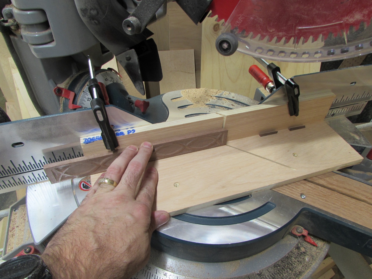 With the top in place, I can now attach the little fish plates that I carved on day one. I set up a sacrificial fence on my miter saw, to safely cut them down.