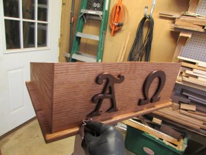 I took a few moments to prep a board for my CNC to start carving out the Alpha & Omega symbols from a piece of walnut. This can run for an hour or so, while I construct the top.