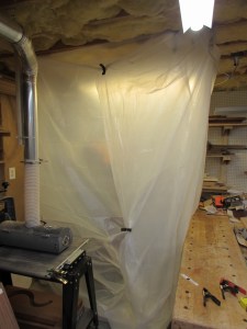 I picked up a roll of plastic to use to construct a temporary spray booth in the corner of my shop. I used large spring clamps to attach the plastic to the ceiling joists, creating a 5’x5′ booth.