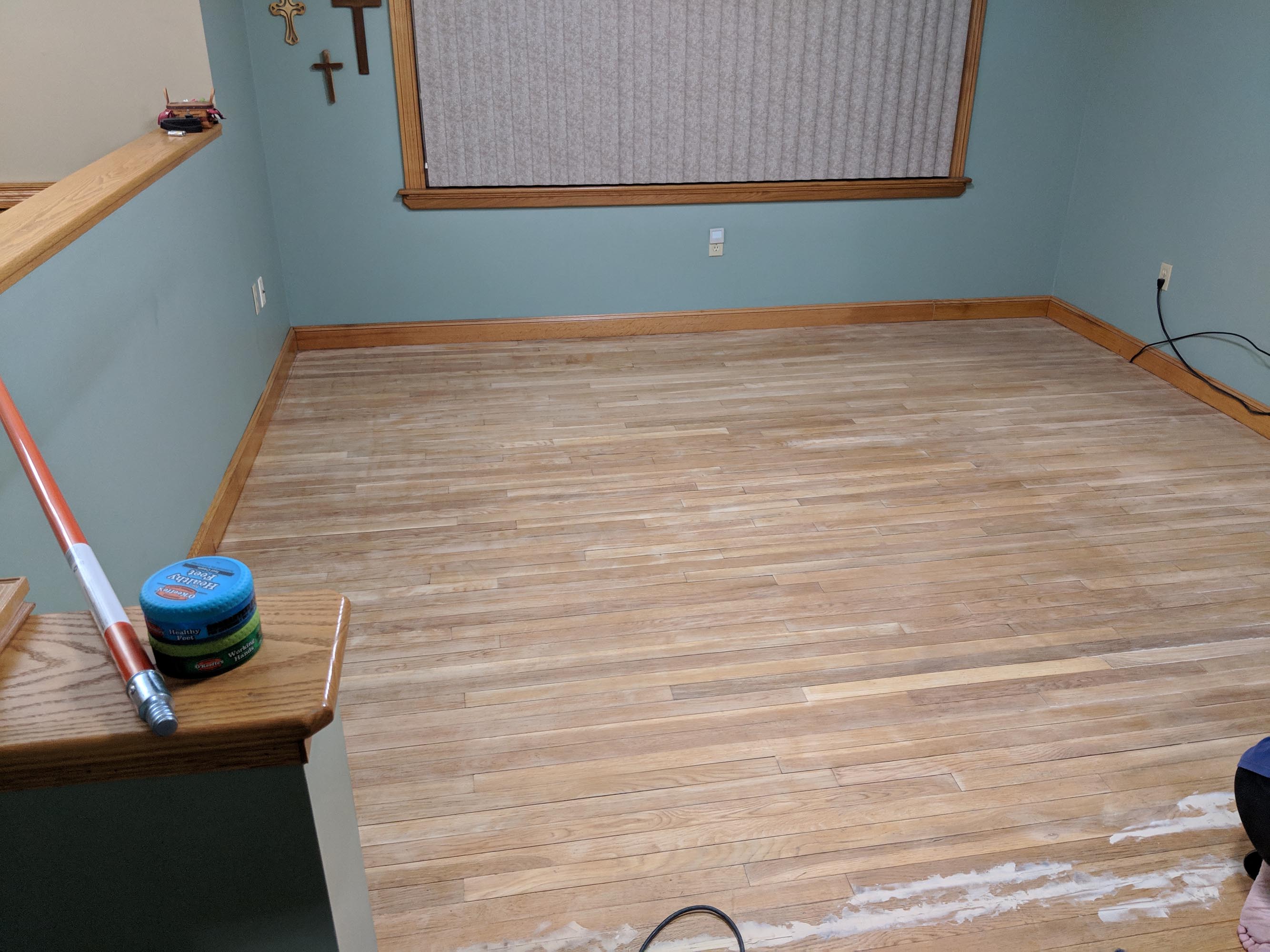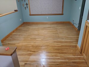 With the new couch on the way, my wife and I decided to make the effort. These floors were installed in 1973 and they were looking a little rough. I have two orbital sanders, but only one vacuum so we took turns sanding, mainly with 120 grit paper.