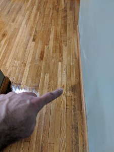 This house has only had air conditioning since we moved in, so that means there was over 20 years of humidity causing the oak floors to expand and then shrink again in the winter. There were a lot of gaps. some of them 1/4″ wide. Wide enough to snag a sock and rip off a large splinter when you walked by. I filled the worst of those gaps, in the high traffic areas, with Timbermate wood filler I used red oak and white oak color to try to match the different tones of the wood. The red oak looked better in the end.
