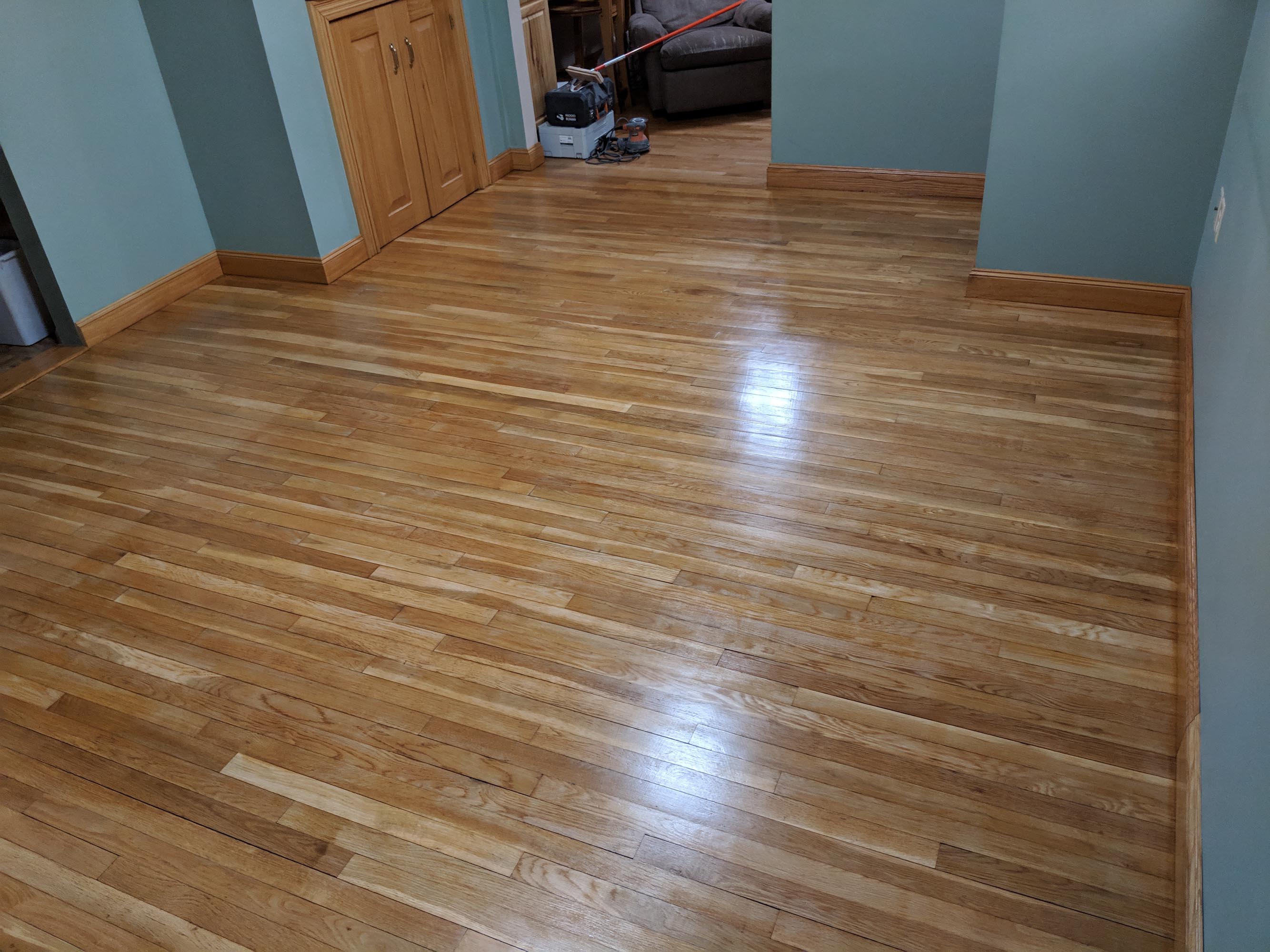 We stopped at the hallway, you can see the color difference between the cleaner, refinished area, but the poly blended well. It actually went on so easily that my wife wants to work our way down the hall and continue to refinish the rest of the main level, one room at a time.