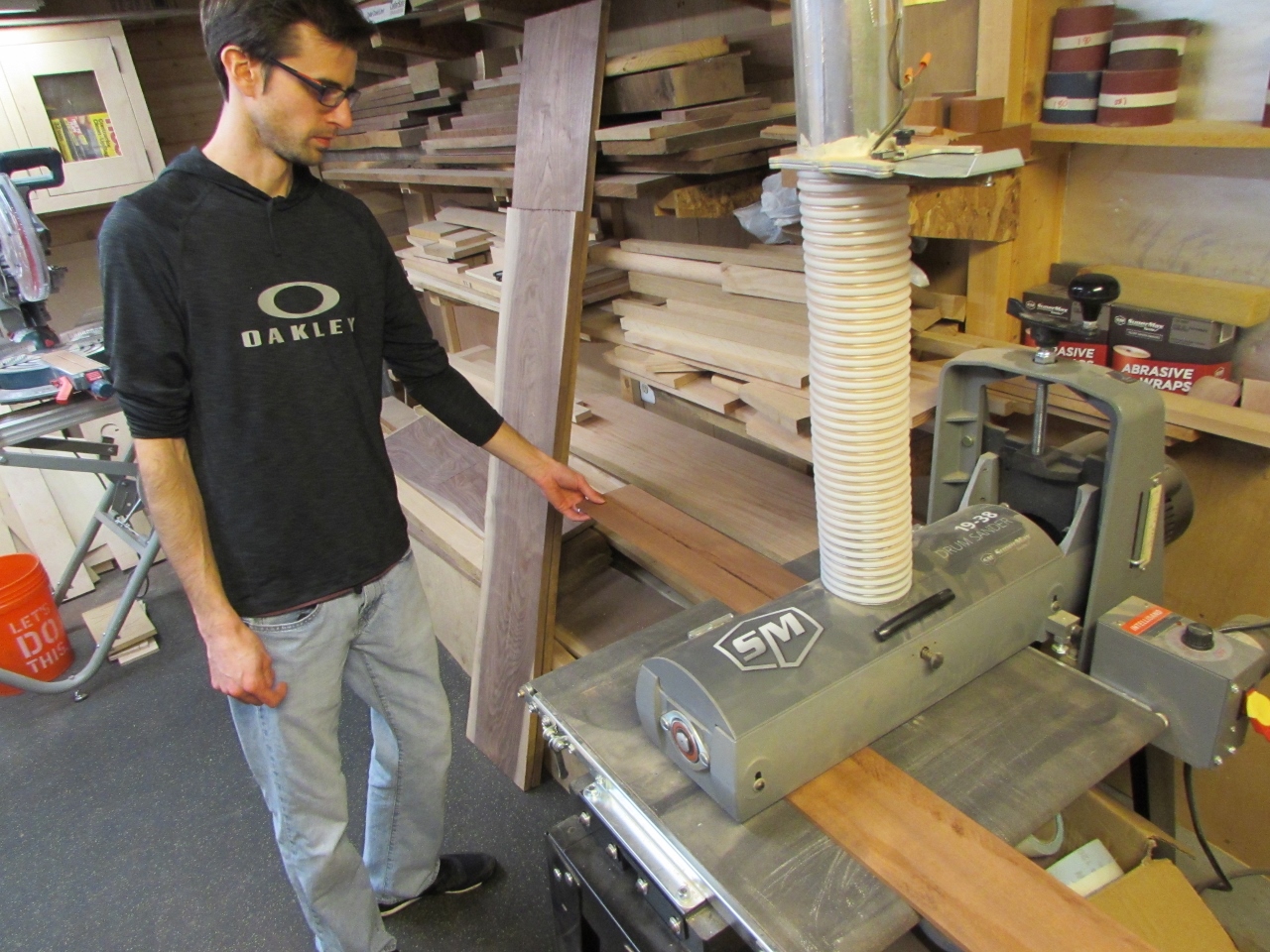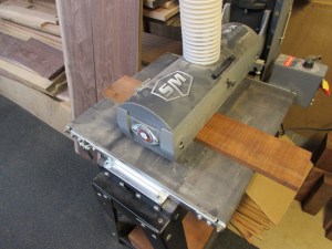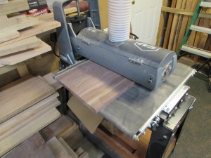 After they were re-sawn, we ran them through my drum sander to smooth out the re-sawn surfaces, then cut them in half.