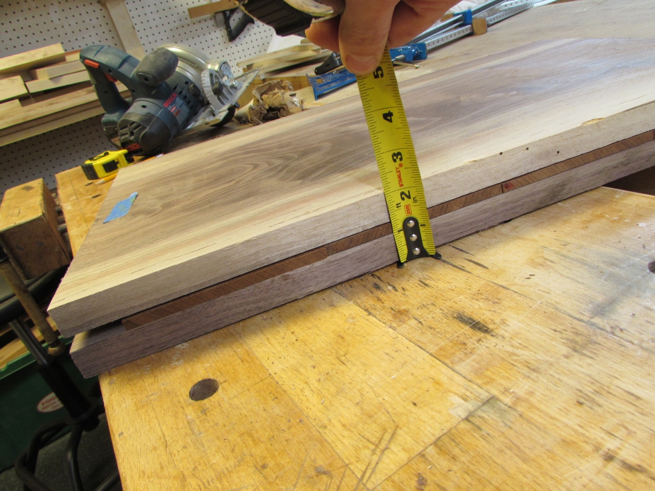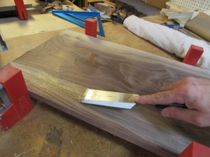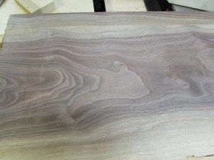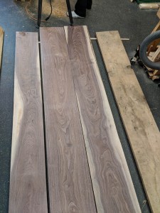 I planed down the three walnut boards. This revealed some beautiful grain. The boards were about 11″ wide and over 1″ thick. They were also very straight. Perfect for making a guitar.