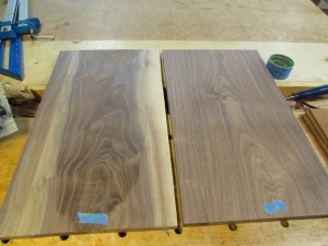 After about 30 minutes, the glue on the panels had set up. We could pull the clamps, and scrape away the excess glue while it was still soft. This saves a lot of sanding and scraping later.