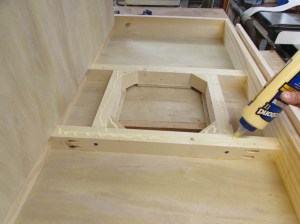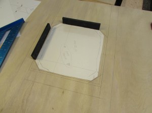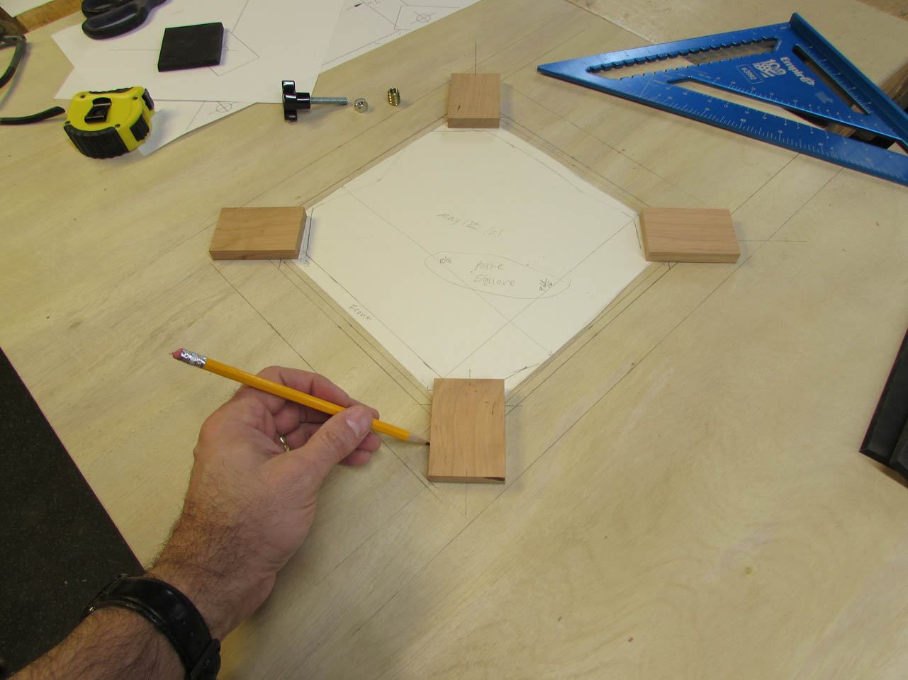 It was requested that I use cherry stain for the bier so I decided to use cherry for the cleats that hold down the base. They will have to be more durable than the pine since I will be holding them down with some heavy knobs. I cut out the cleats and laid them in place. Using my traced base and my layout lines, I determined the best location for the hole in the cleat. Then I traced their locations leaving about 1/32″ clearance, all the way around.