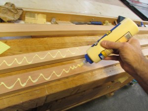 I spread some wood glue along two of the boards and used a piece of veneer to make sure the glue covered the entire surface.