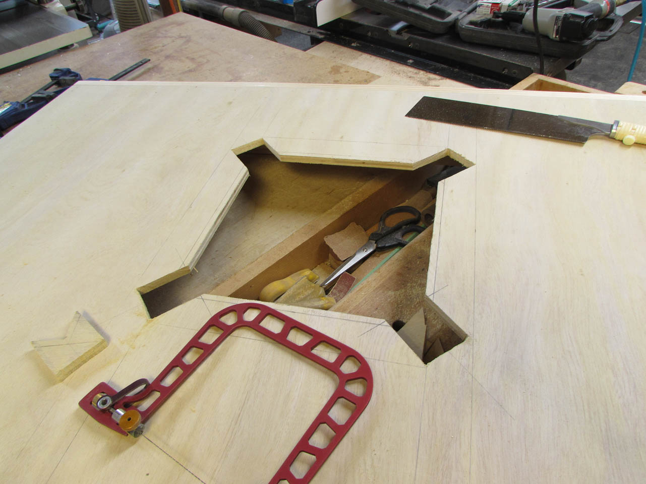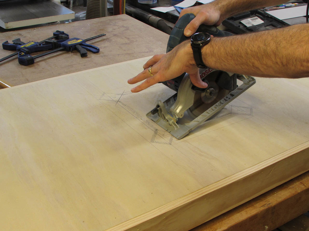 Now that my plywood was elevated above my bench, I decided to cut out the hole for the socket. I used my circular saw to cut out the main square, carefully dropped down onto the line.