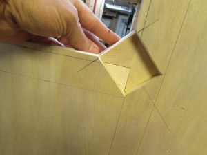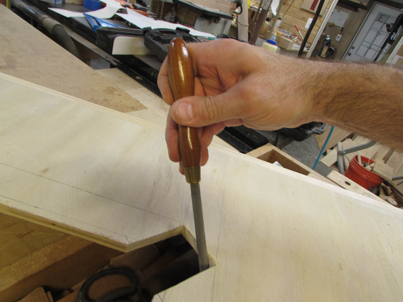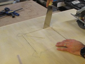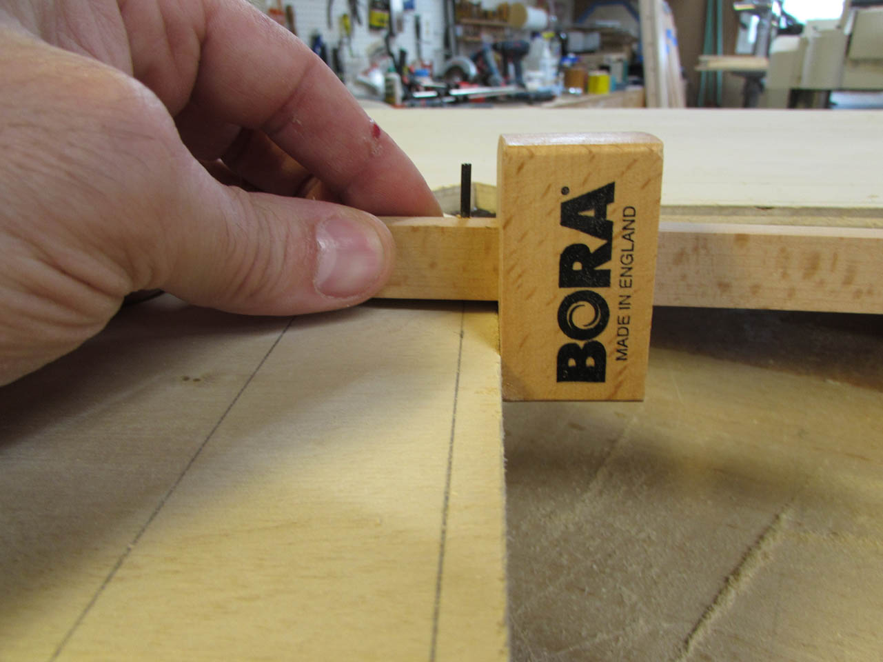 On the reverse side of the plywood, I used my marking gauge to lay out the back side of the foam that will line the socket, then marked 1-1/2″ past to locate the structural supports.