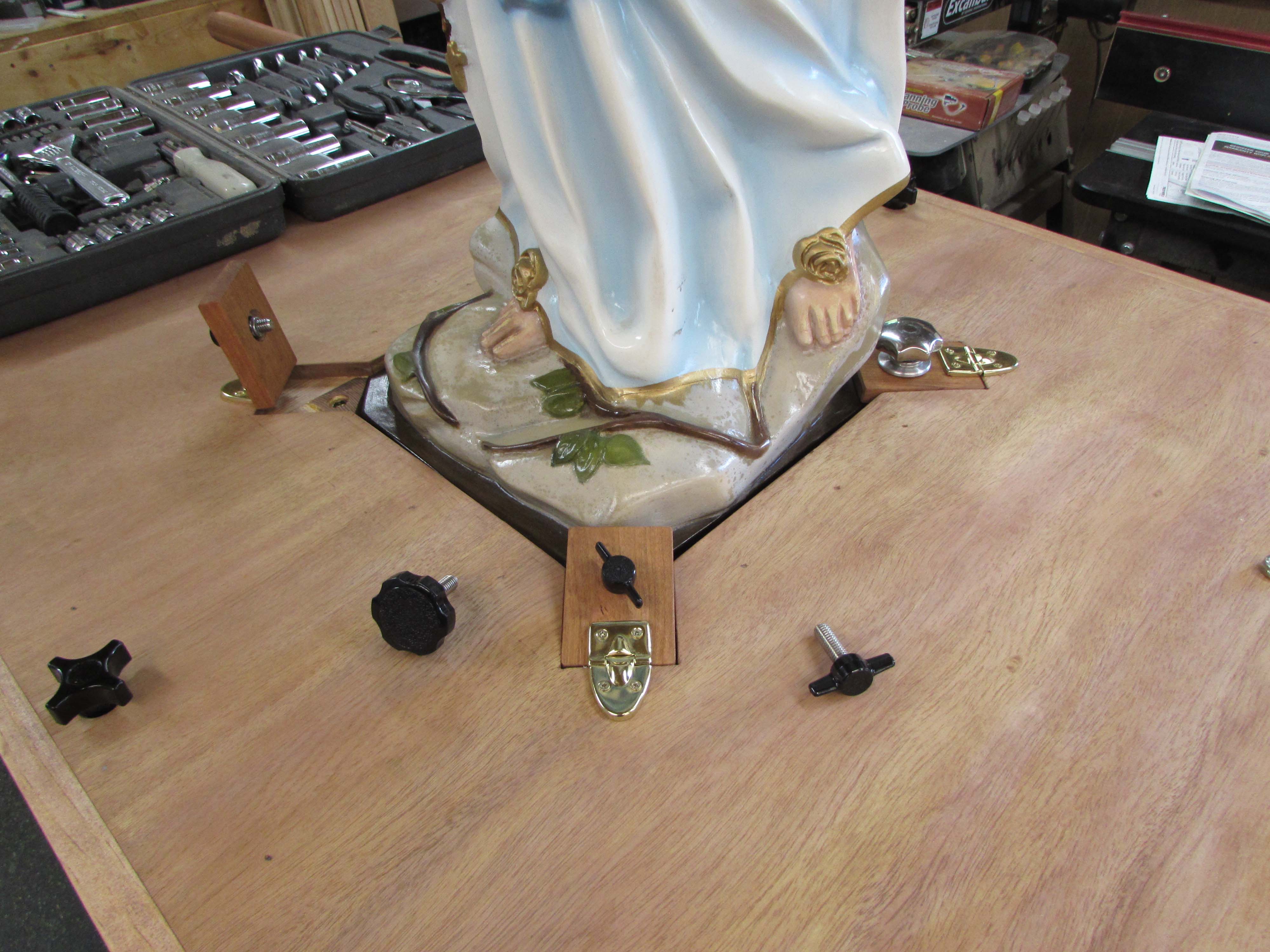 The statue fit well in any direction, but the stone at the base of the statue overhung on one corner and was in the path of a cleat as it was being lowered to the base. It would close just fine if the statue was leaned over a bit, but we decided to take about 1/8″ off of the end of each cleat. The other problem is that the base is 1/8″ taller in the rear which currently leaves two cleats flush and the other two up in the air a bit.