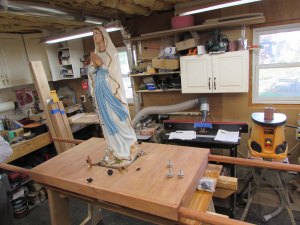 The stain has set over night. It is not quite cured enough to apply finish, but it is dry enough that you can touch it without staining your clothes. I have the statue on loan for an hour, so we did a test fit. Everything worked as planned, but we decided to make a few adjustments.