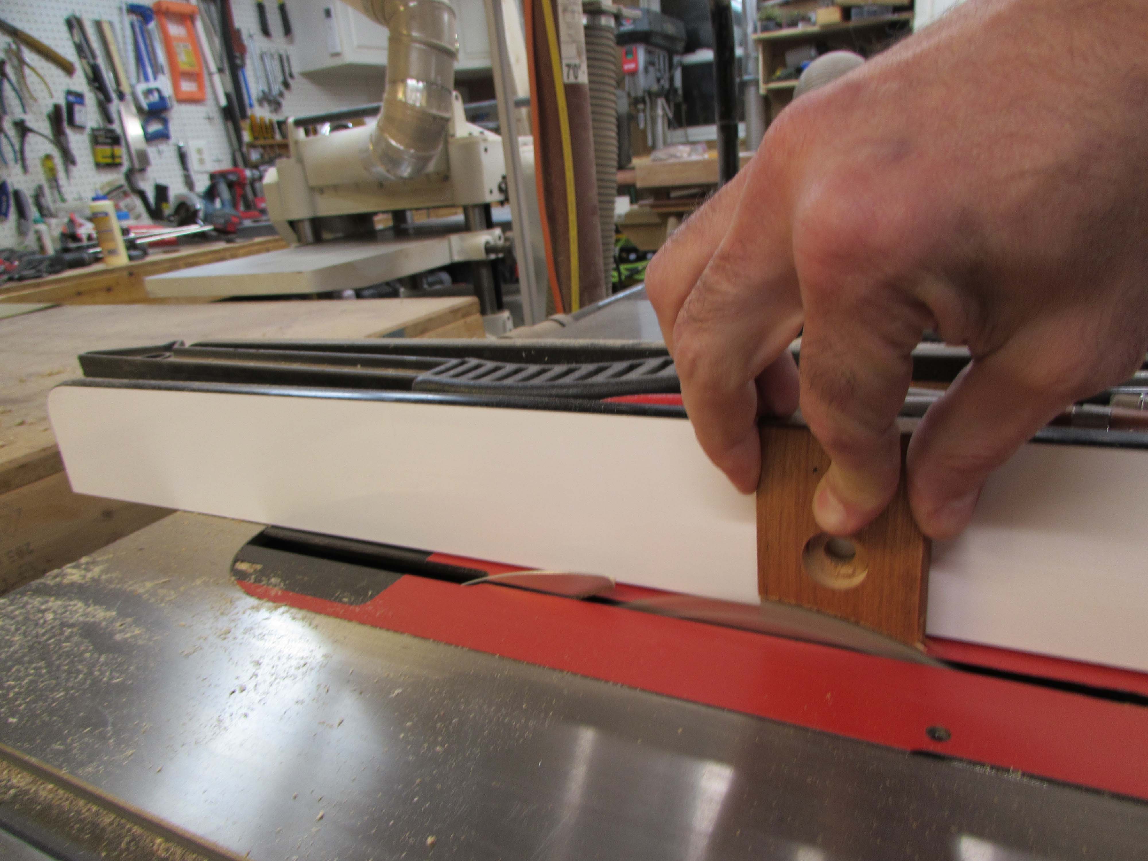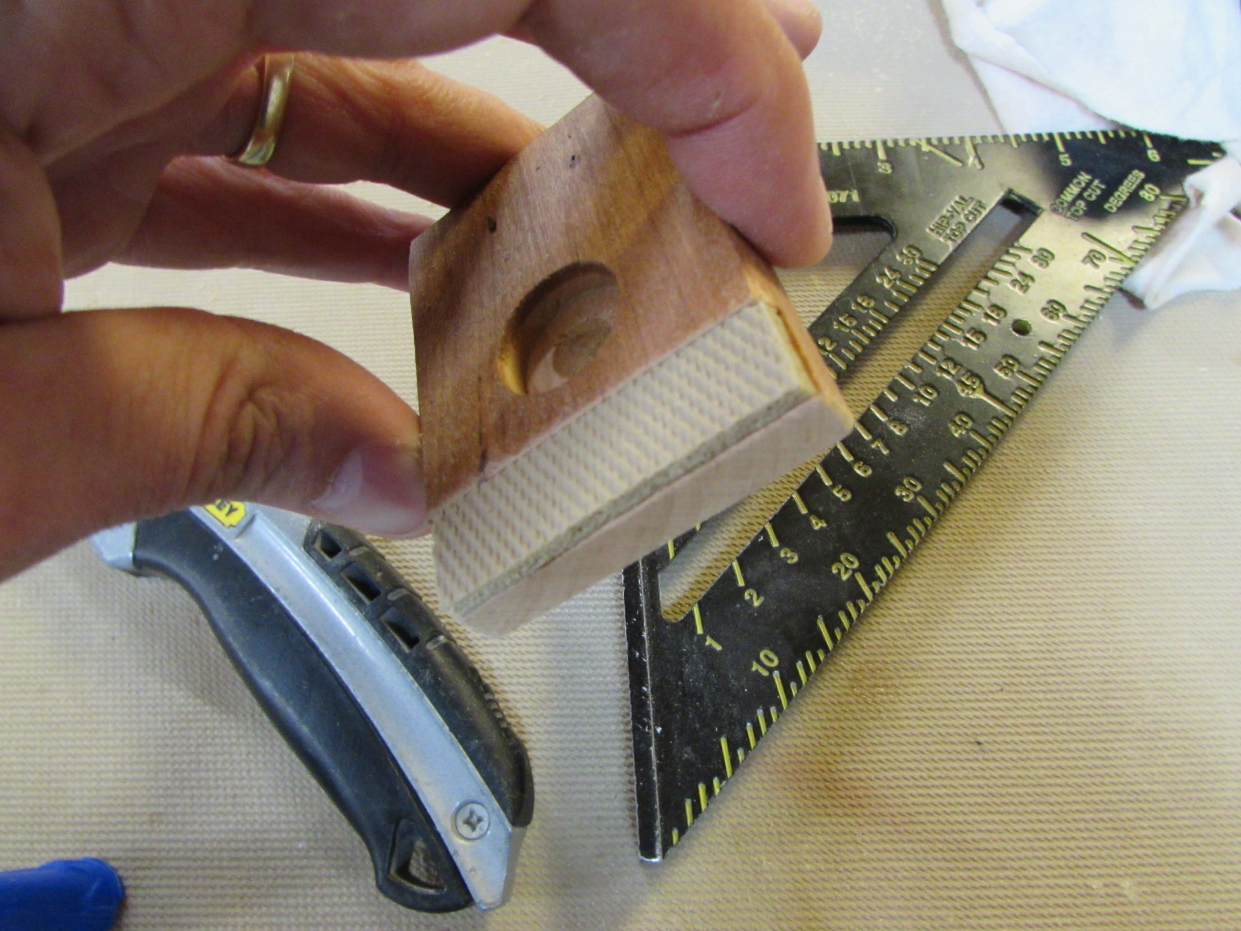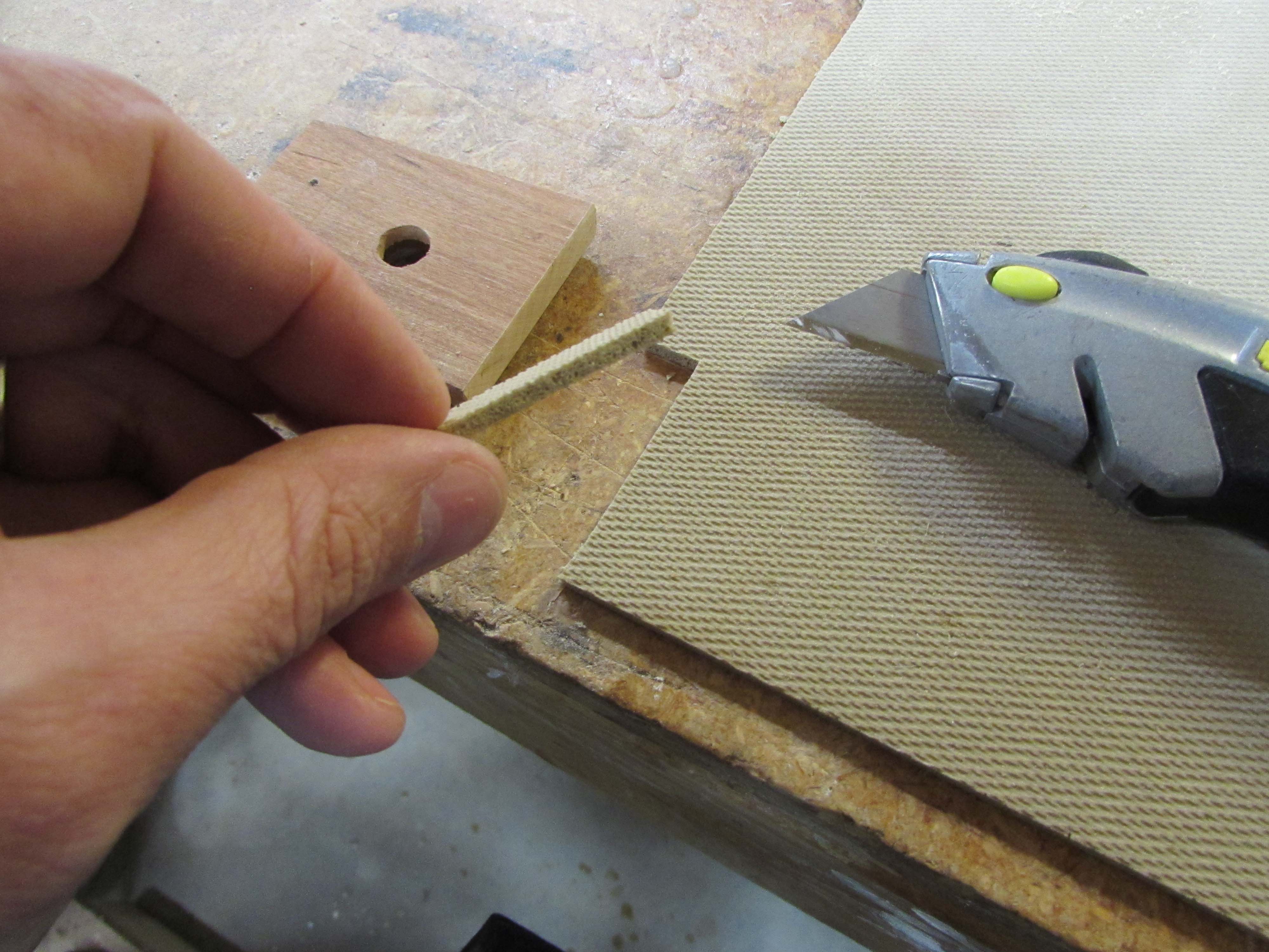 I carefully cut this notch away on the table saw. Then I cut off a corner of the non-slip mat that I use on my bench.