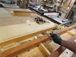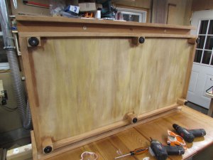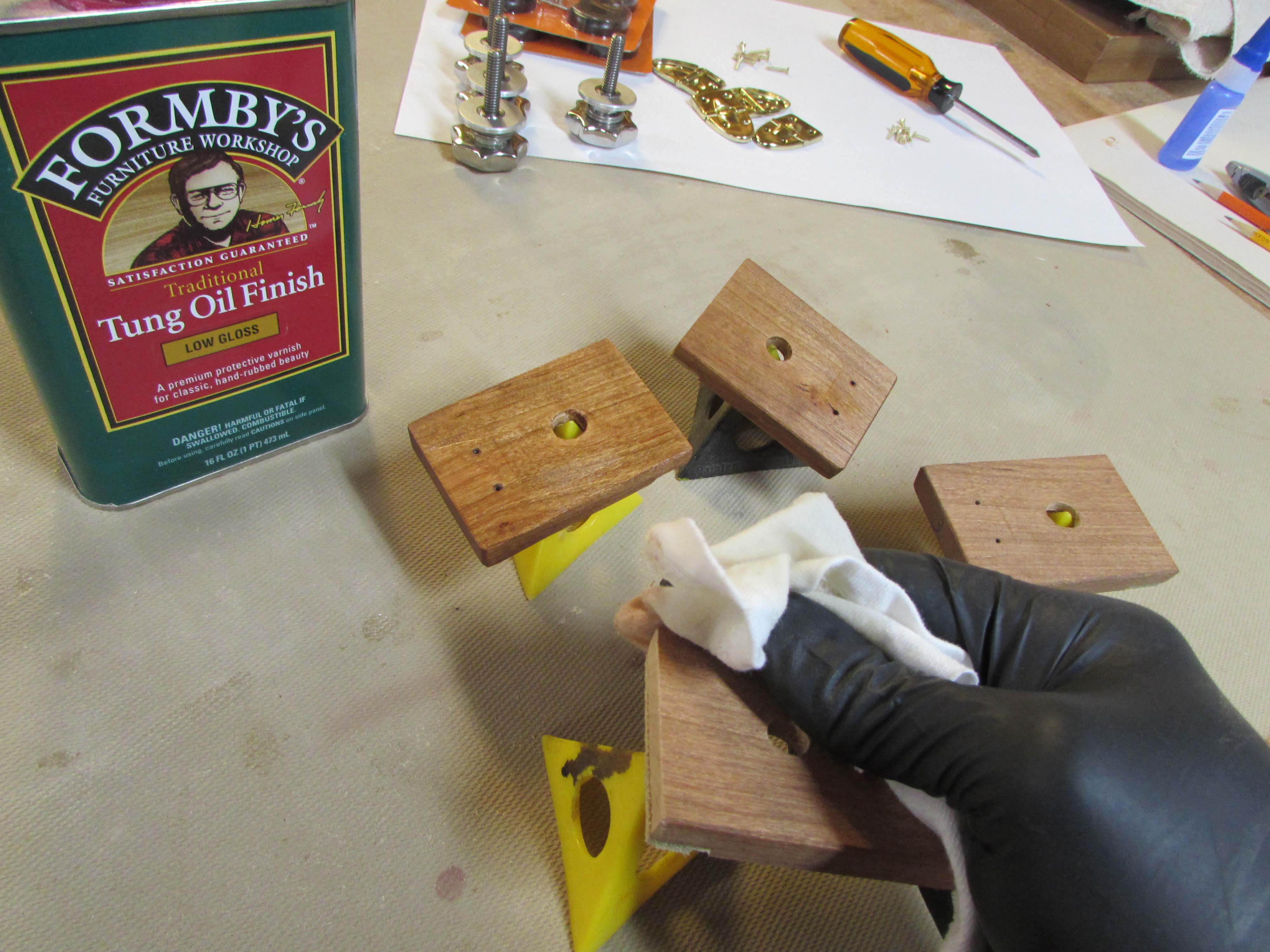 After removing all of the hardware, I started to apply the finish. I have two components of this project that have close tolerance fits. The cleats and the rails. If I use a finish that builds a film, they will jamb in place and get stuck, so for these areas, I am applying two coats of polymerized Tung oil. The first two or three coats actually soak into the wood and harden below the surface. So I applied Tung oil to the square section of the rails as well as the sides and under-side of the cleats. I also applied Tung oil in the cleat pockets as well. Those areas won’t be visible, but I wanted a bit of protection in case the bier was used in the rain or something. A coat or two will help to protect against moisture entering the wood and causing swelling.
