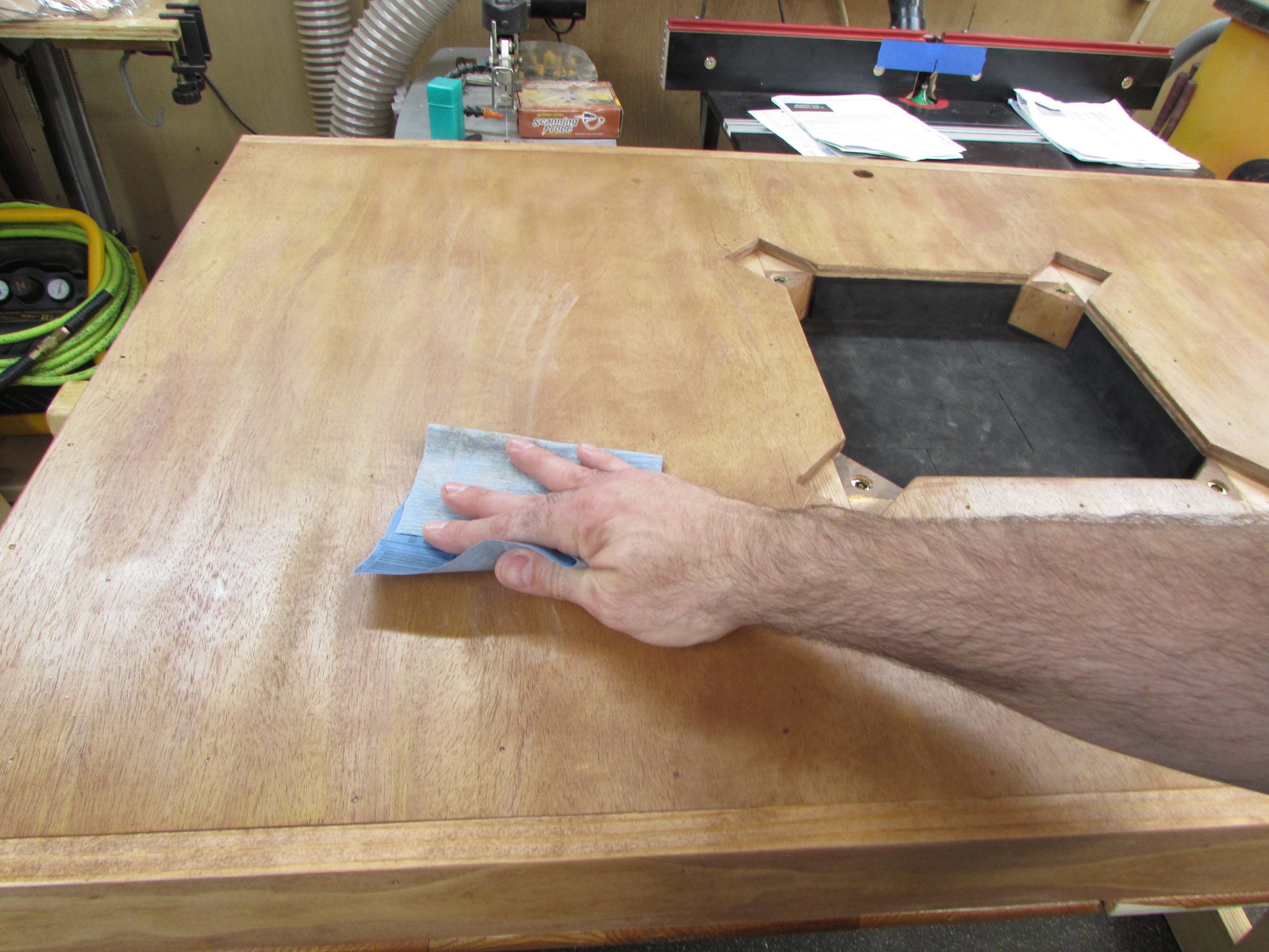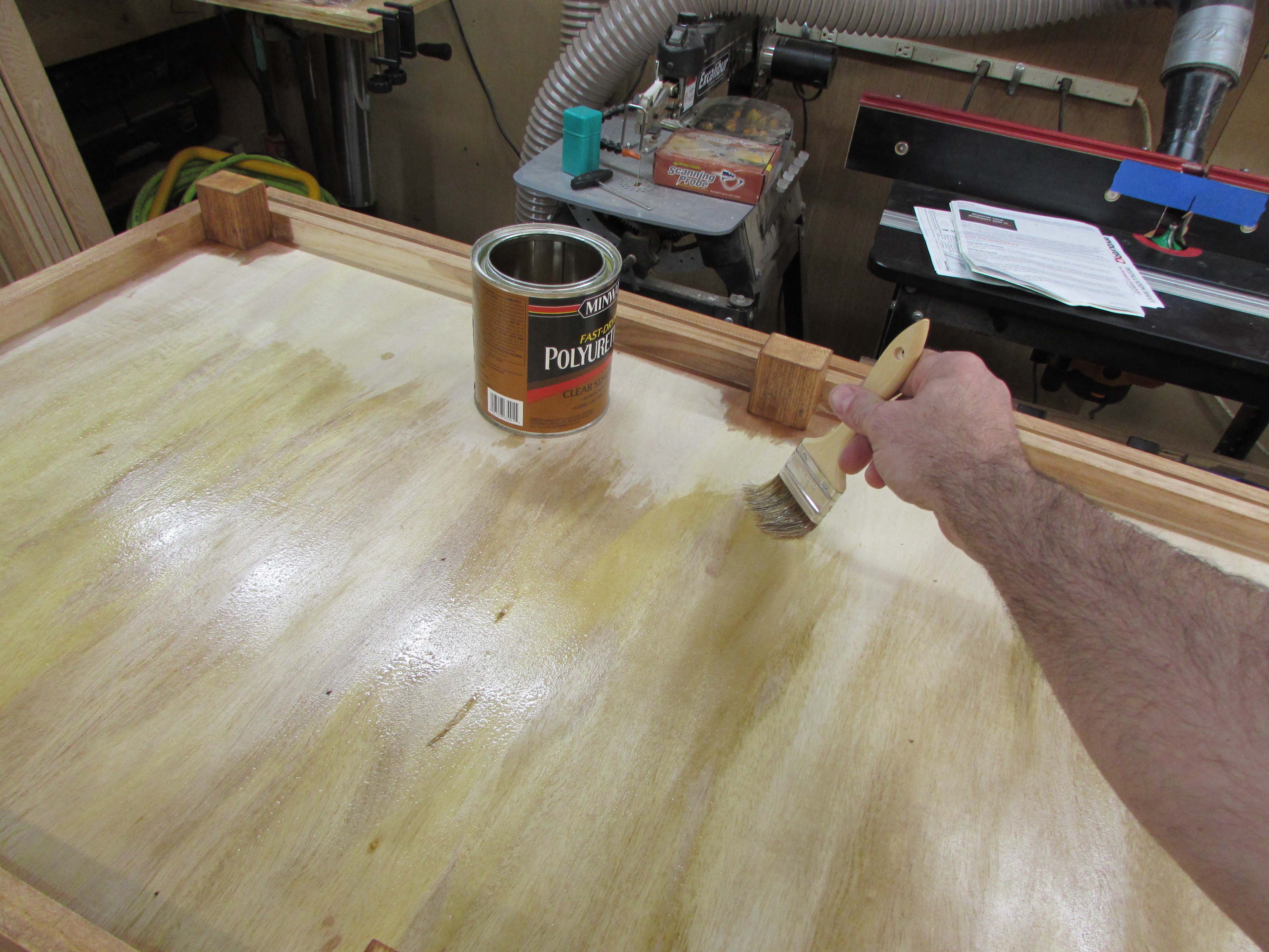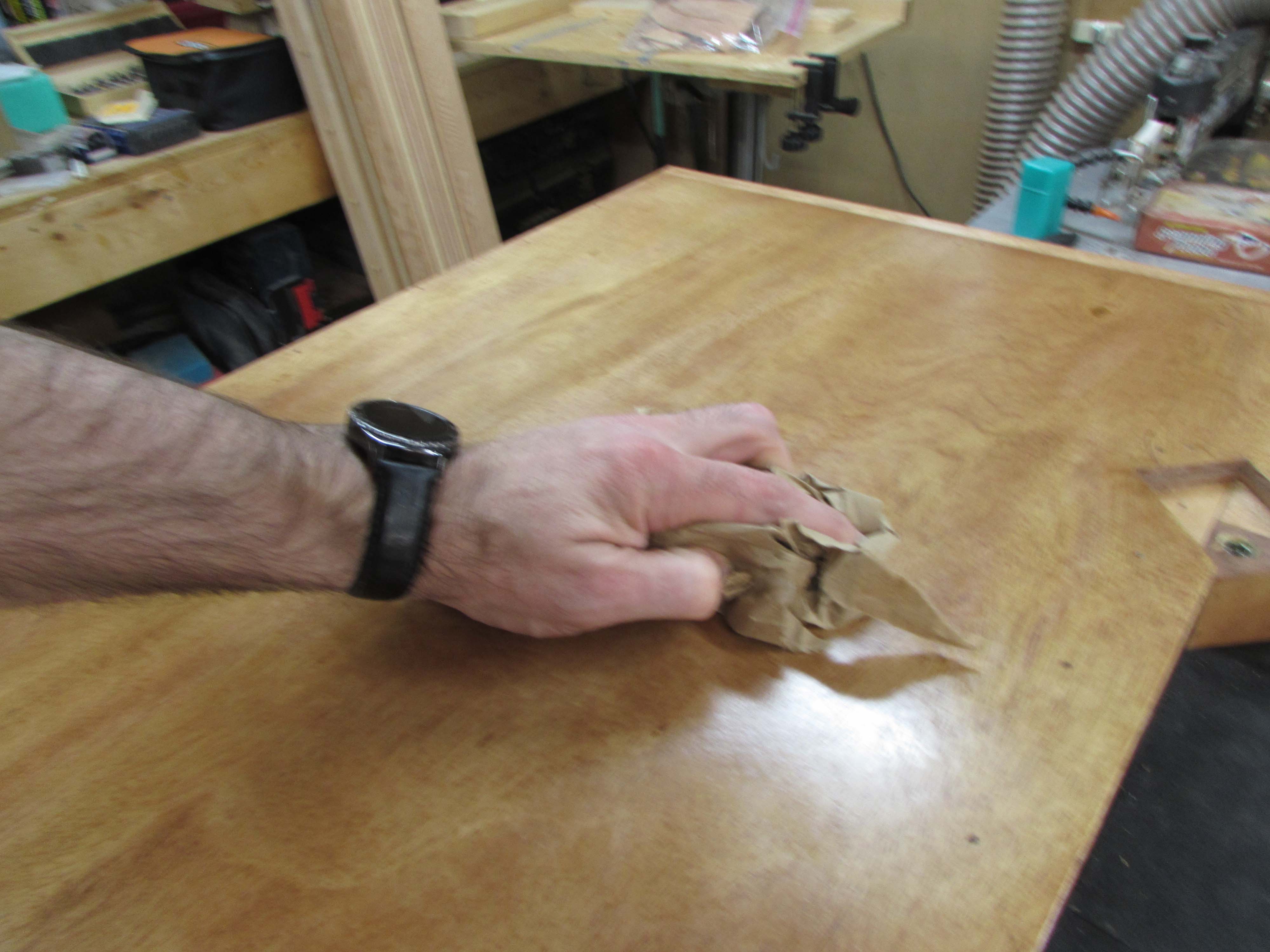 The process was repeated again for the third coat and when that was dry, I rubbed down all of the urethaned surfaces with a crumpled piece of brown paper to remove any remaining dust nibs and polish up the surface a bit.