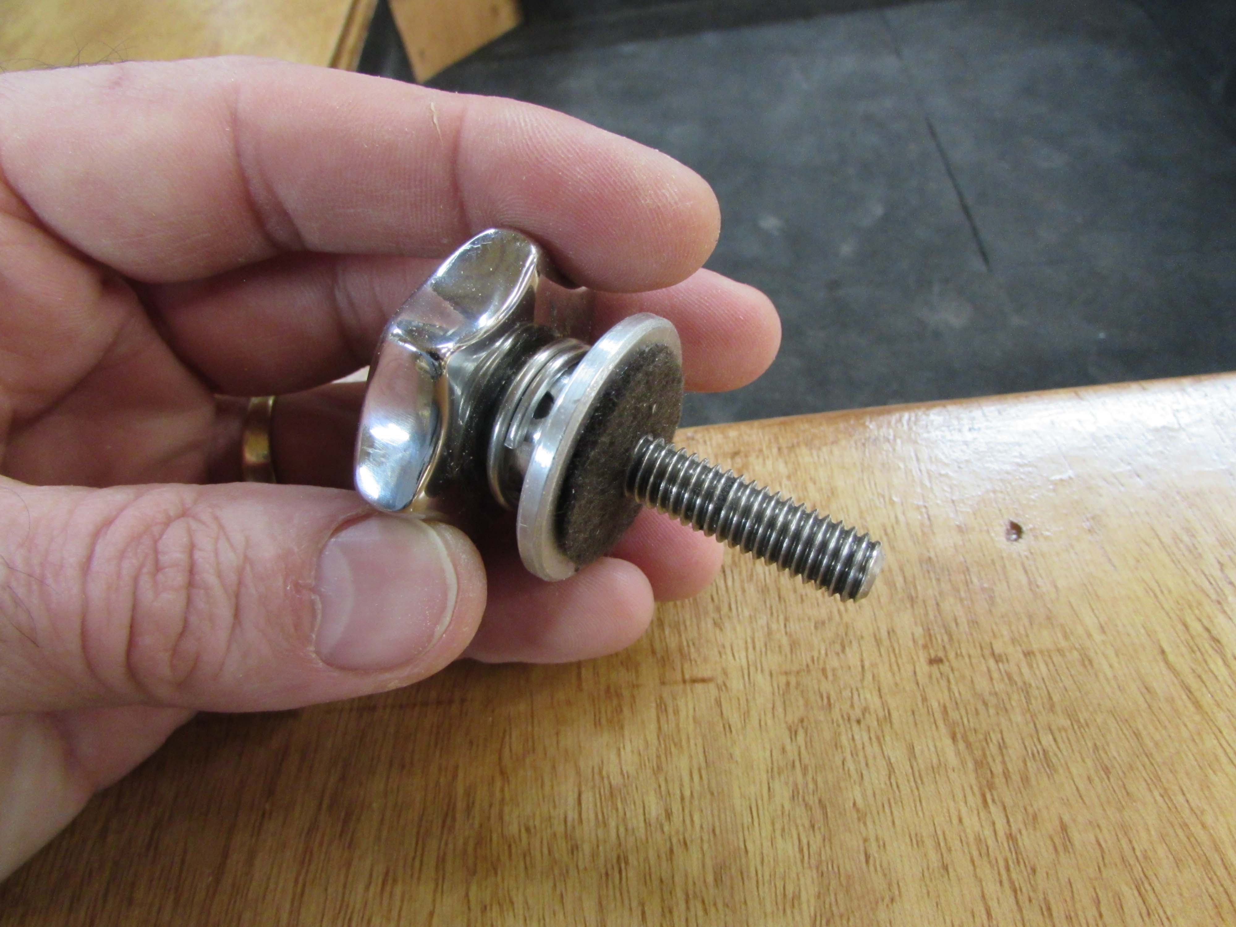 The captive thumb screws do work, but they have to be angled slightly and carefully threaded in. If not they will be easily cross-threaded. This will be a problem because you can not always control who will be doing the tightening. We decided on a different approach. I had a couple of different thumb screw options lying around the shop and we settled on this stainless steel knob that I had modified to add a captive key ring around the boss. We decided to tie a clear nylon string (fishing line) to the key ring and attach the other end to the bier. The ring spins freely so you can tighten without binding the string around it. I also added an adhesive-backed fuzzy pad to the bottom so it wouldn’t scratch up the cleat.