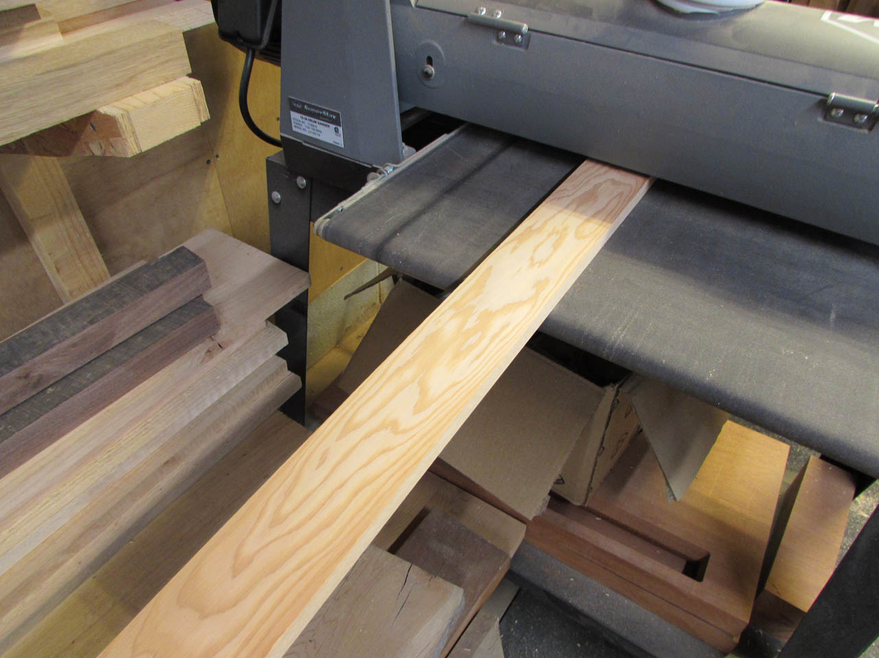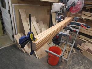 I pulled up my original designs and double-checked some of the dimensions. It seems that the simplest way to convert to a bed would be to replace the sides with bed rails. The feet are attached to the head-board and foot-board so if I remove the mattress frame and sides, I should be able to attach new sides and slats. This will be just the right size to accommodate a full size mattress (54″x75″). A standard twin mattress is only 38″ wide, and I couldn’t figure out how to make that work with the existing head and foot boards, so full size it is. I spent a lot of time on the computer, making sure I could fit everything without disturbing the crib hardware. Here is what I came up with: BED PARTS.pdf. I will be attaching to a rather heavy head and foot board, so I wanted good, stiff sides and rigid hardware to hold it all together. I started by breaking down some 5/4 hard maple. I rough-cut the boards to length, then started cleaning them up.