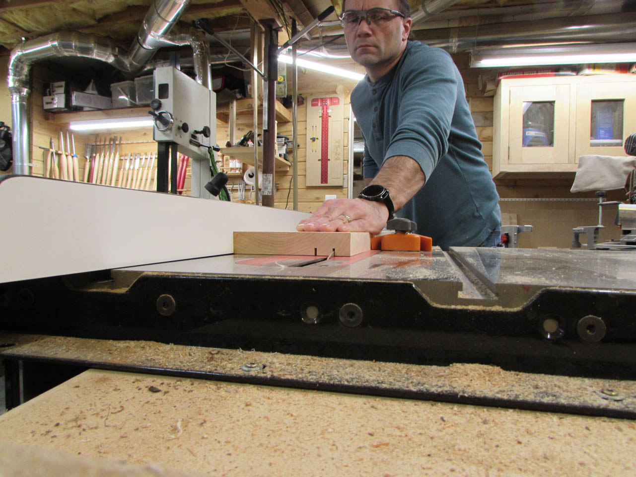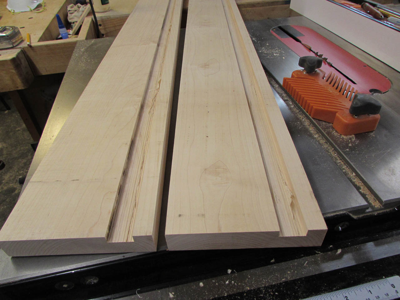 Switching back to the maple, I made several passes on the table saw to create the channel that will receive the slat support board.