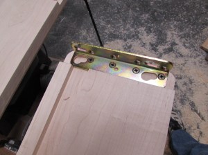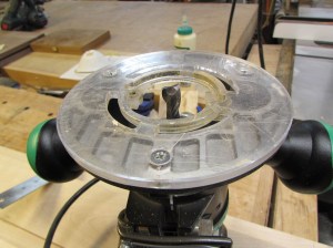 To accommodate the mounting hardware, I have to reduce the thickness on the ends of the sides. To do this, I set up a home-made Tee-square guide for my router to ride against, then set a 1/2″ cutter to the proper depth in my router.