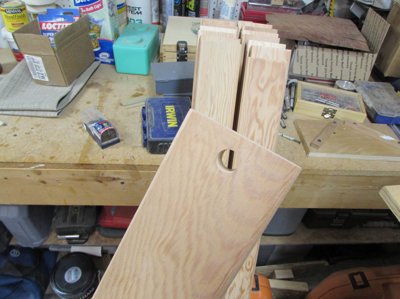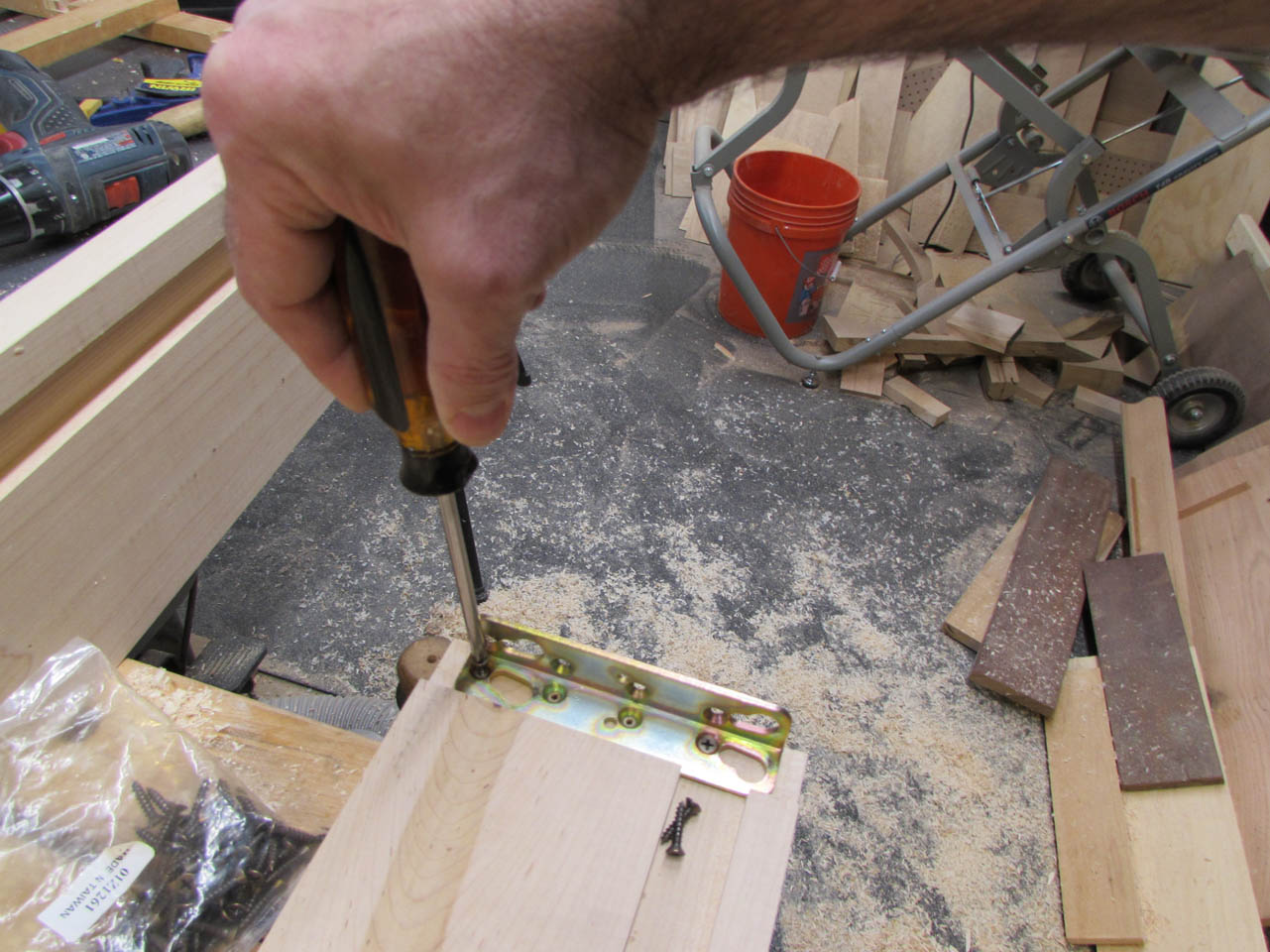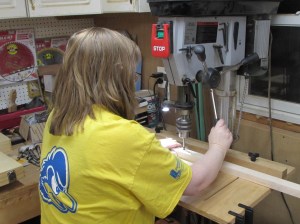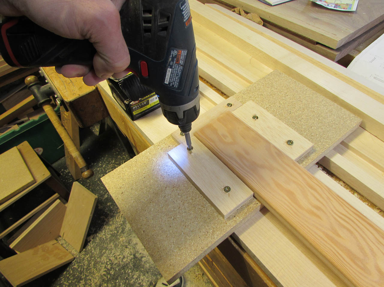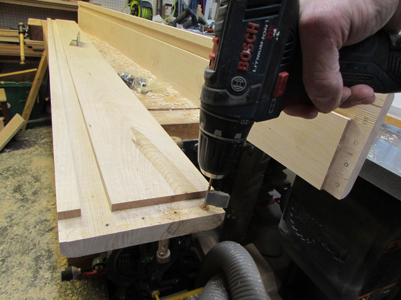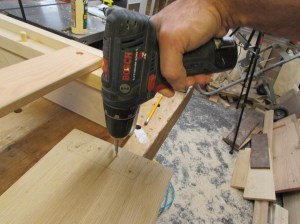 While my wife was drilling out the holes for the dowels, I was cutting the dowels down on the band saw.