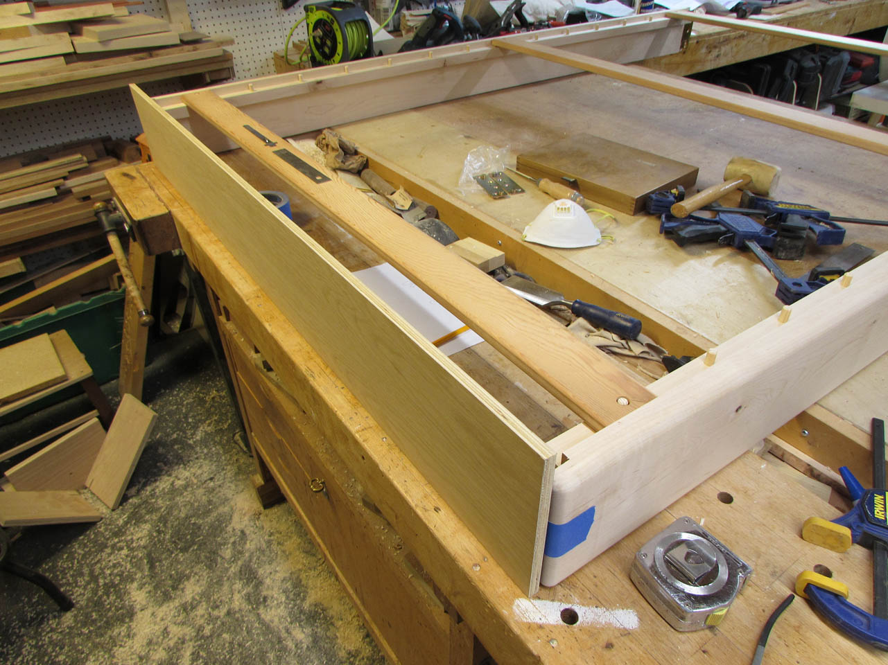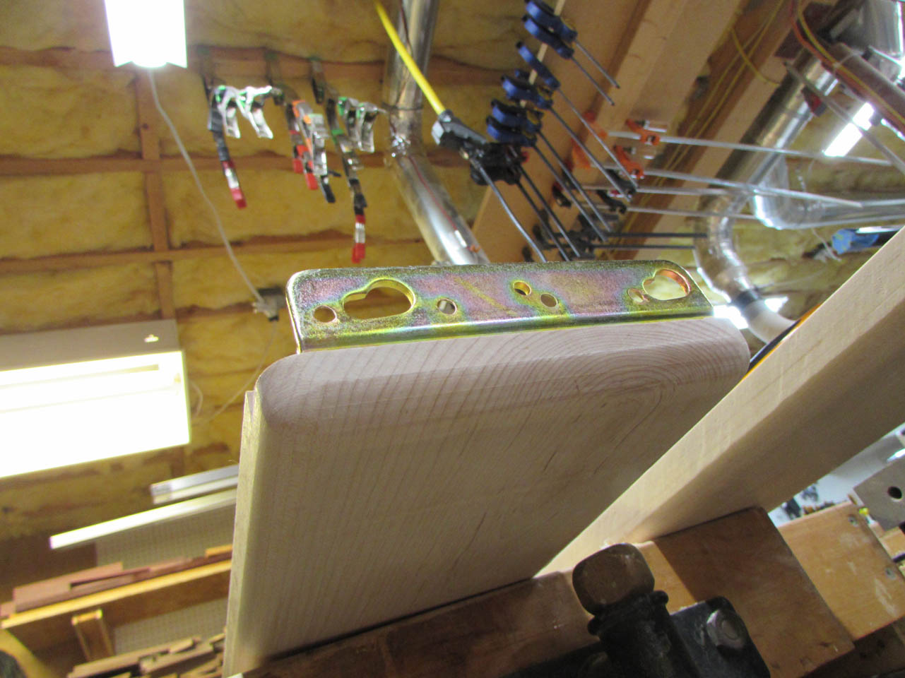 When dry, I installed a few slats and squared up the whole assembly. Then I taped the receiver plate to the mounting brackets and placed a scrap piece of plywood up against the end to mark the receiver plate location.