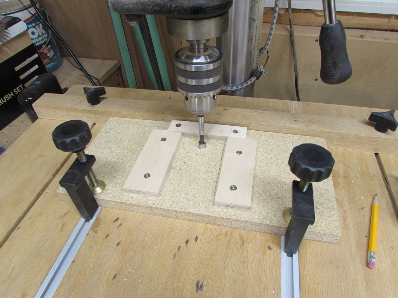 Bouncing back to the slats for a bit, I created a jig to mount on the drill press, that will allow me to drill a hole in each end of the slats, at the exact same location.