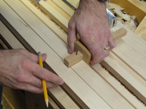 The next step was to divide the length of the slat support by the number of slats and lay out the locations of the dowel pins.