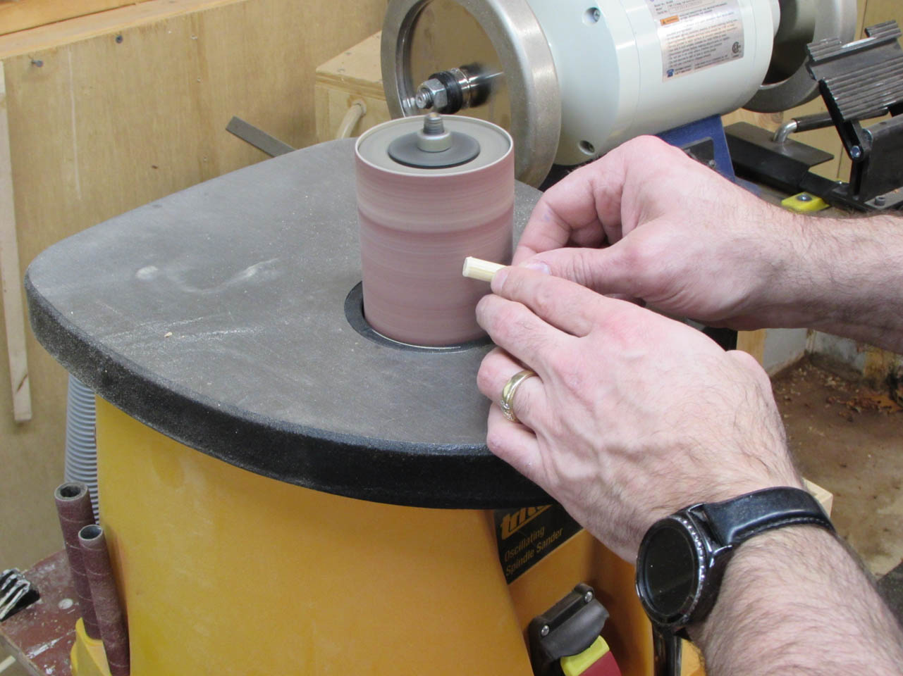 I used my spindle sander to chamfer the edge of the dowels to ease installation.