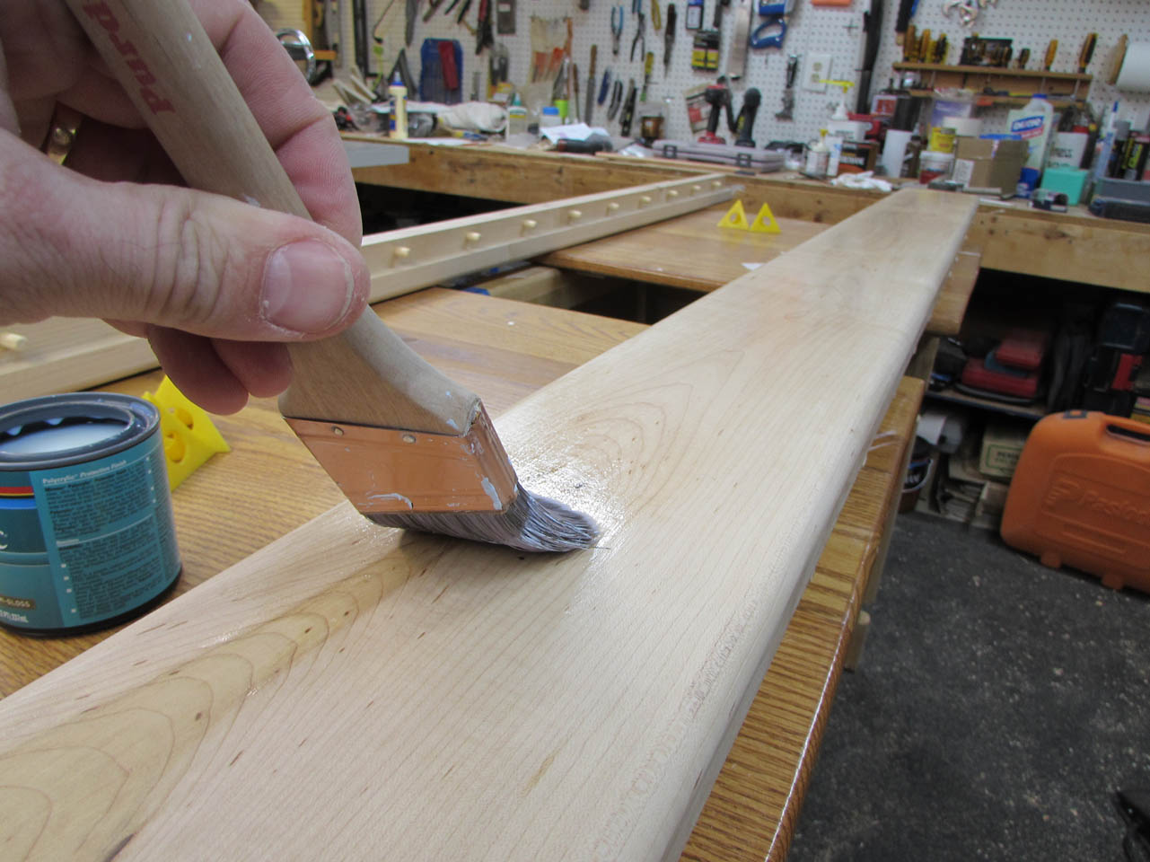 I am using a satin, water-based polyurethane so after the first coat, I sanded back the raised grain with 220 grit paper, then proceeded to apply two more coats, waiting about two hours between each coat.