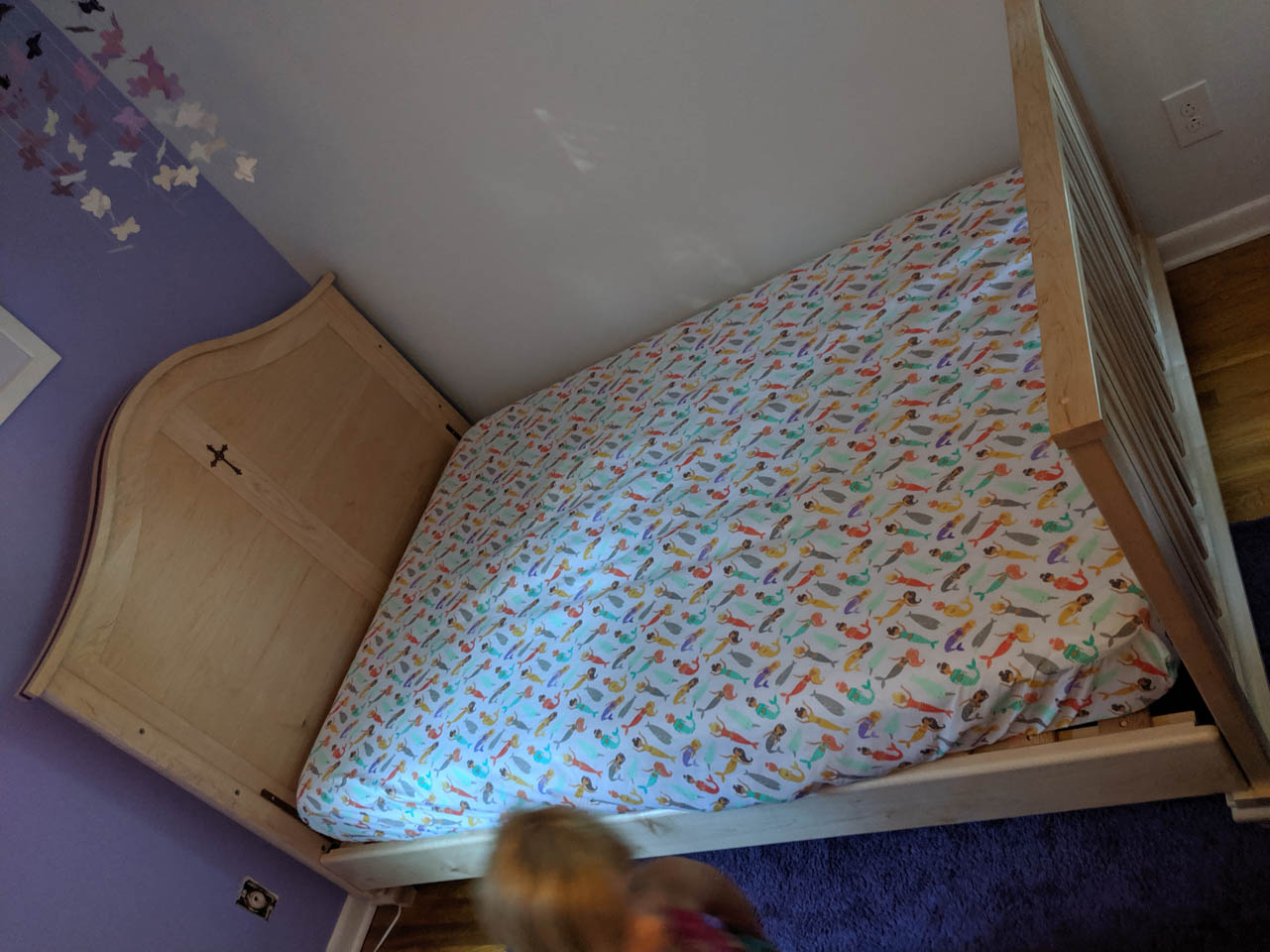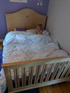 The mattress was dropped in place with the mermaid sheets already installed. Little Charlotte grabbed a book and her comforter and settled into her new bed.