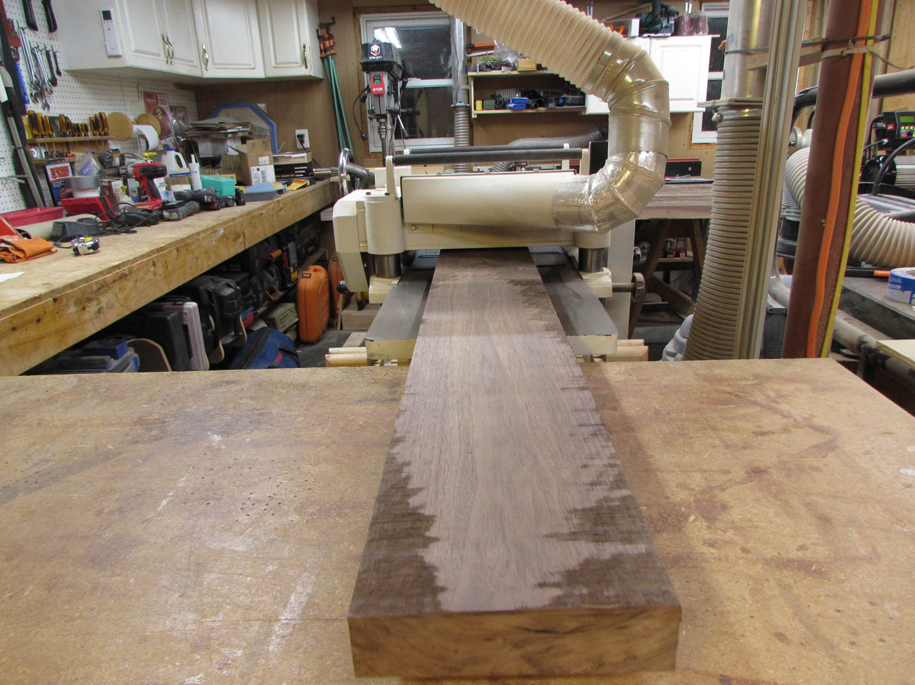 For the first cut, I grabbed a smaller piece of the new walnut and ran it through. The helical head is very quiet compared to a straight knife cutter head, and the board slid through with ease. I took a 1/32″ cut and removed the high spots.