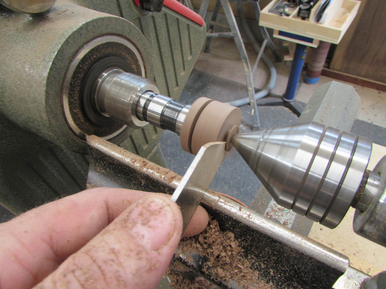 Then I cut a rough plug from a swirly-grained board and put it on the lathe.
